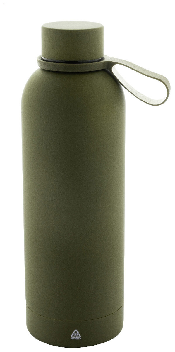 Dvoustěnná vakuová láhev z recyklované nerezové oceli s pogumovanou úpravou a silikonovým páskem, 500 ml.