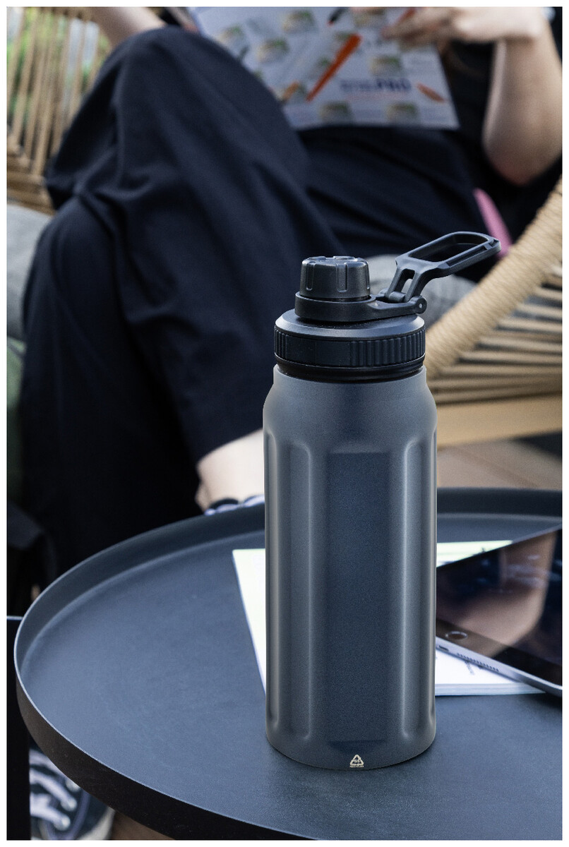Dvoustěnná termoska z recyklované nerezové oceli s vertikálními drážkami. S víčkem z polypropylenu a s integrovaným držadlem. 540 ml.