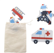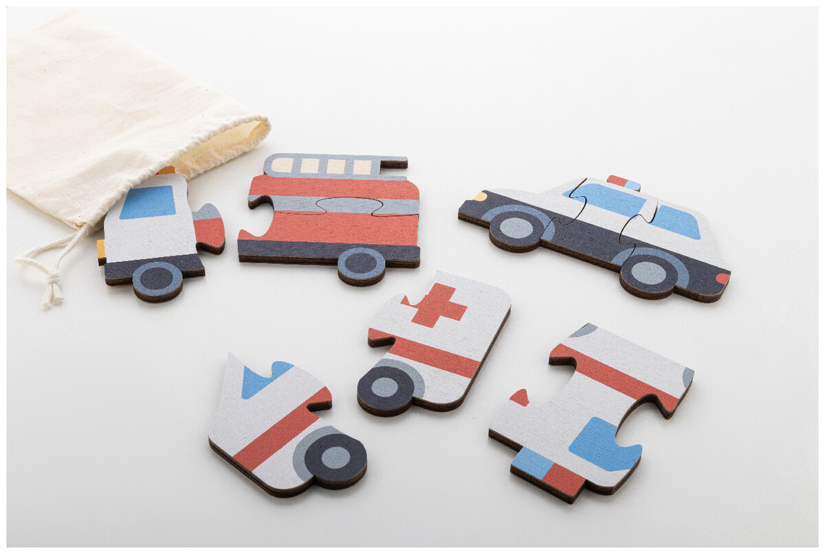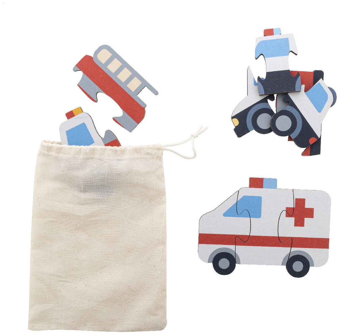 Dětská sada puzzle z březové překližky se 3 tematickými motivy. V bavlněném přepravním pytlíku.