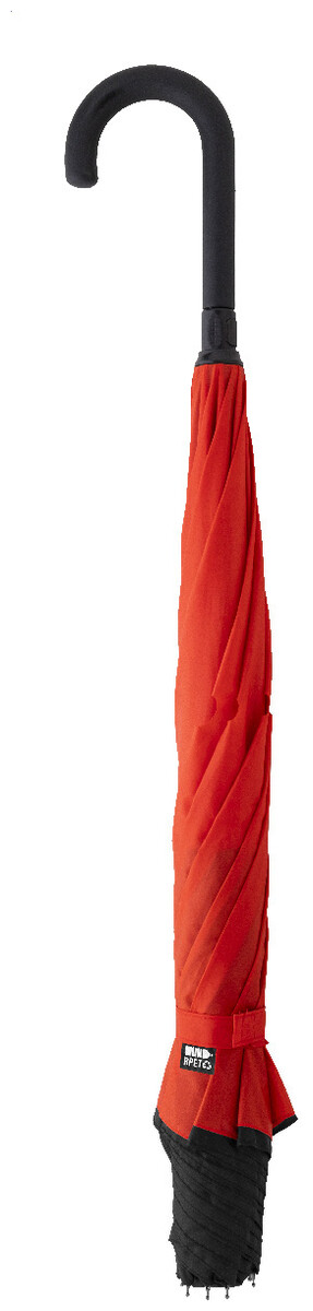Manuální větruodolný deštník s reverzním otevíráním, 8 panely, dvouvrstvou dvoubarevnou stříškou, kovovým rámem, žebry ze skelných vláken a pogumovanou rukojetí. Materiál: 190T RPET pongee. S výrazným štítkem RPET.