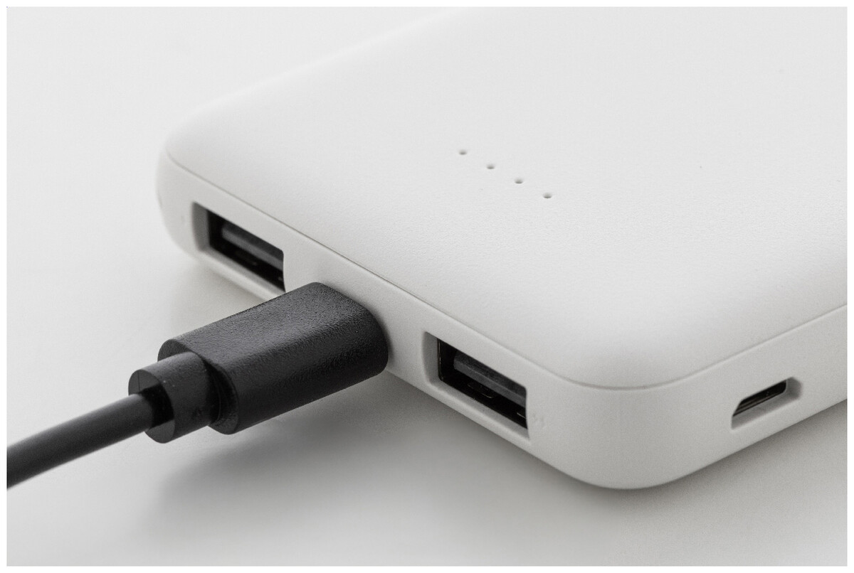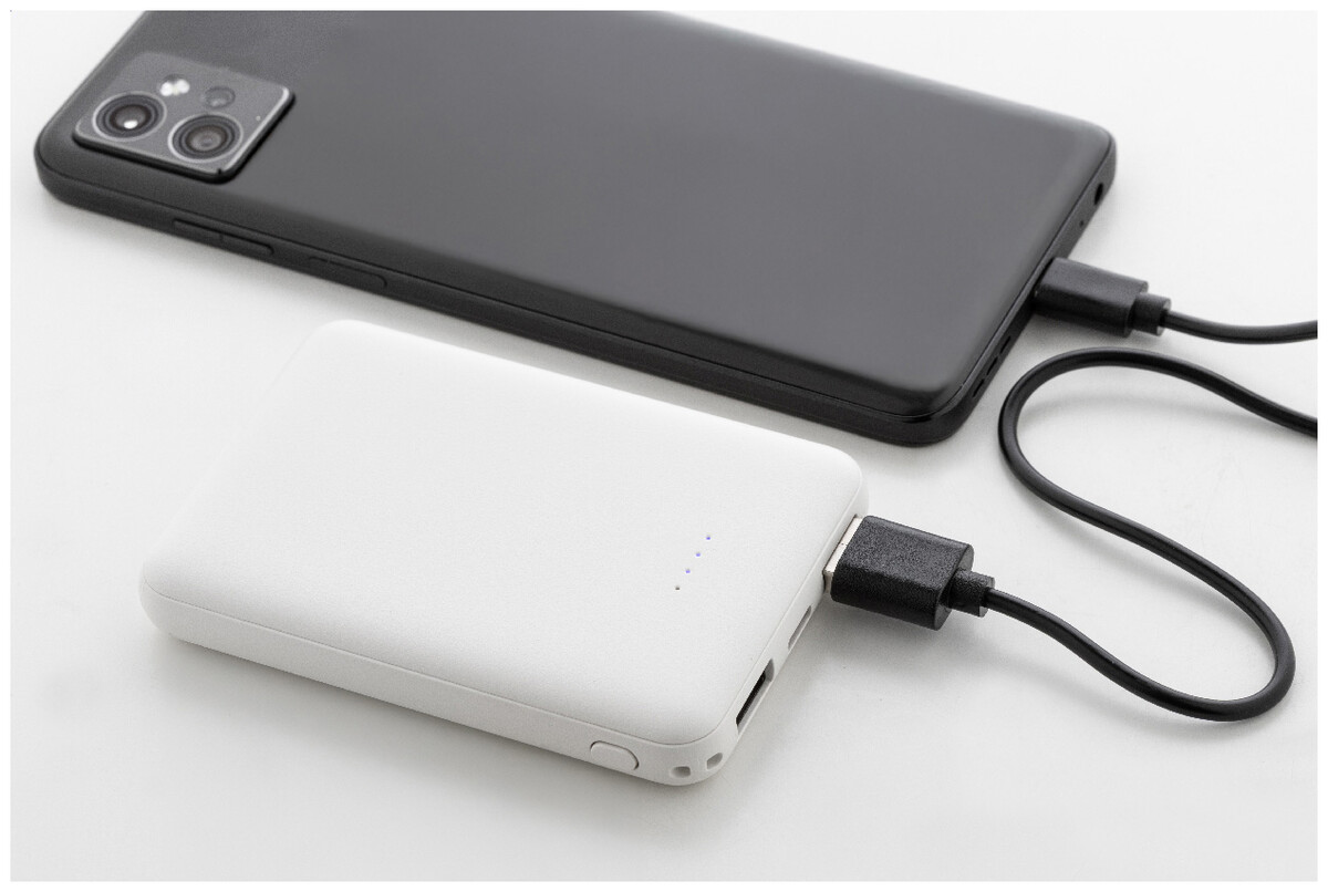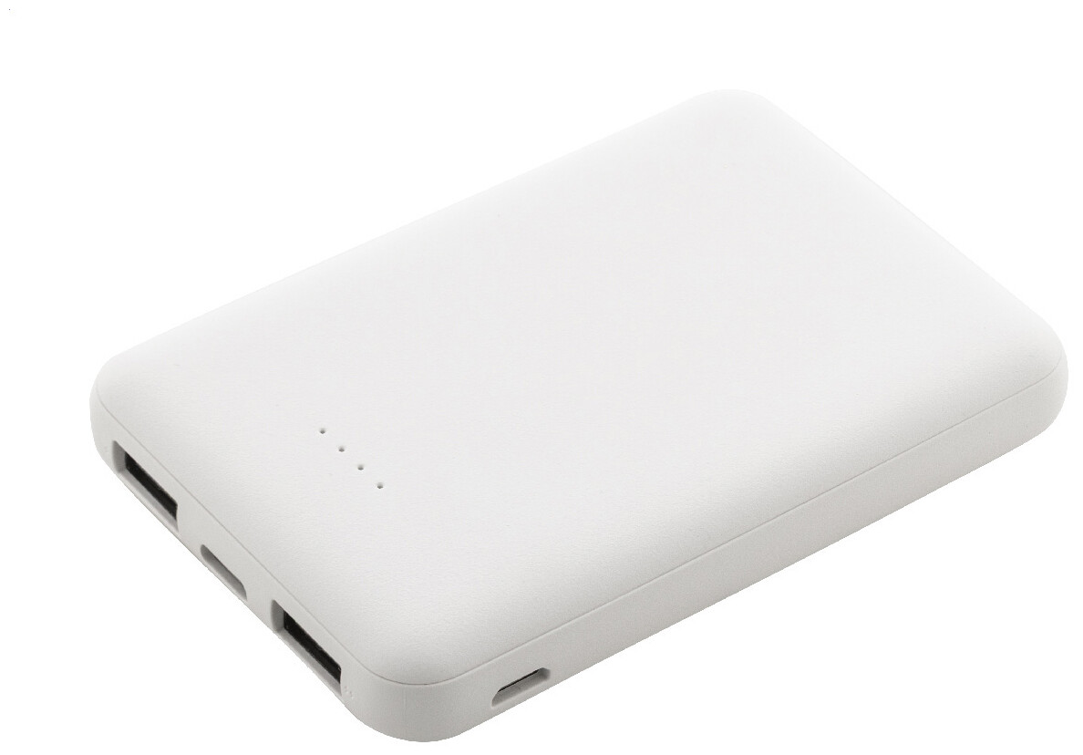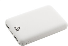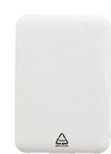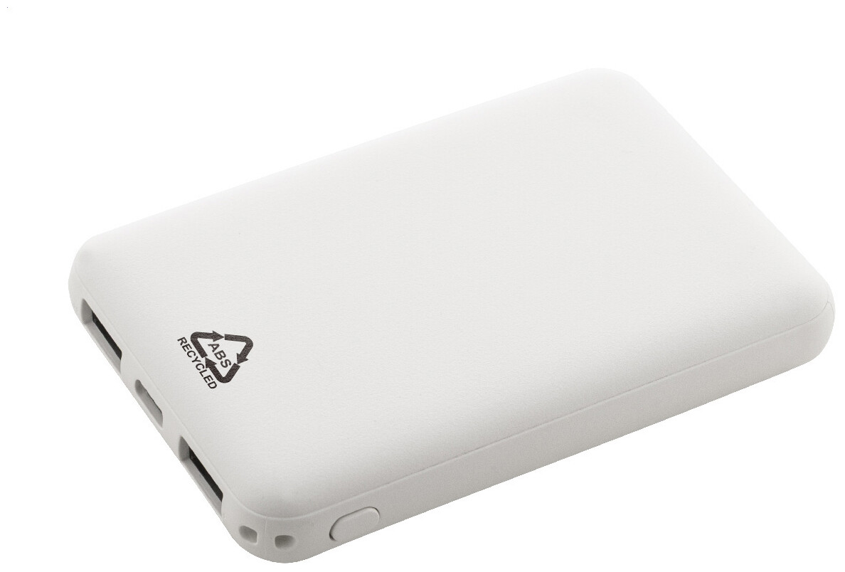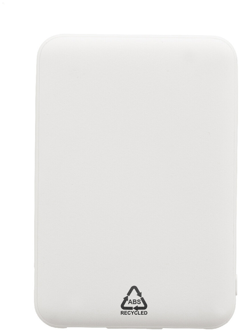 Power banka z recyklovaného ABS plastu s baterií 5 000 mAh. Se 2 USB a 1 nabíjecím portem USB-C. Vstupní porty micro USB a USB-C. Včetně nabíjecího kabelu USB.