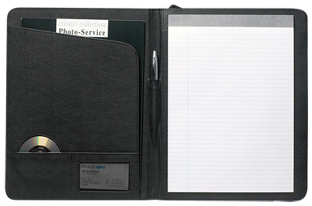 Sloha na dokumenty z černé kůže s kovovým štítkem nahoře, s linkovaným blokem a přihrádkami na dokumenty, vizitky a pera.