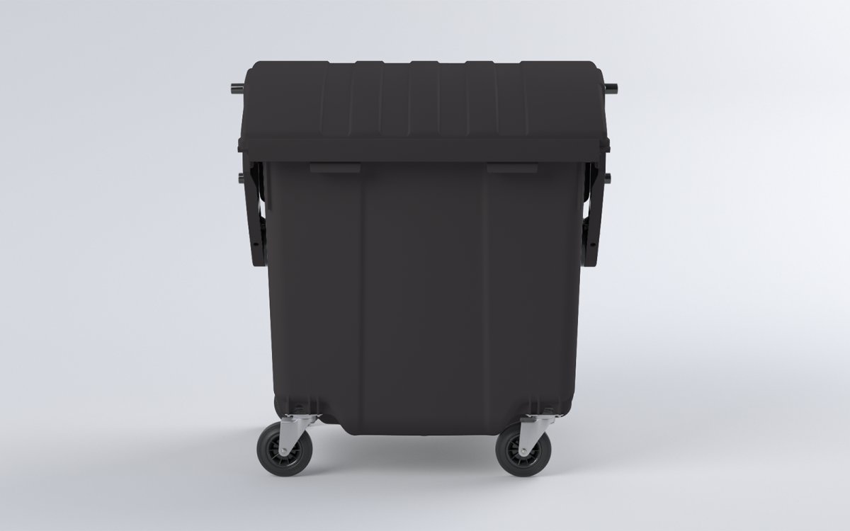 Kontejner s horním výsypem o objemu 1100 litrů je opatřen kulatým víkem.