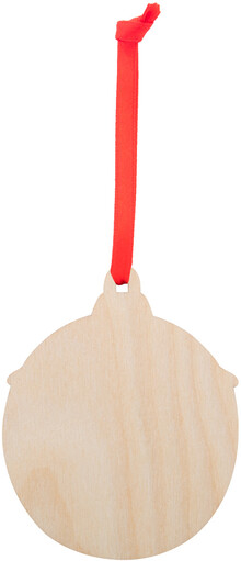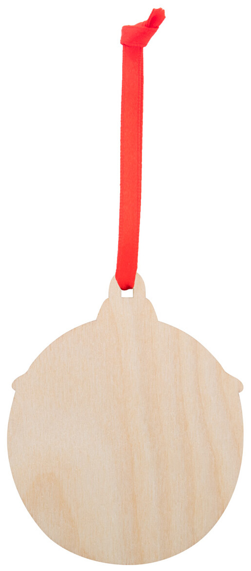 Vánoční ozdoba z březové překližky, s tištěným vánočním designem a červenou stužkou, která je dodávána zvlášť.