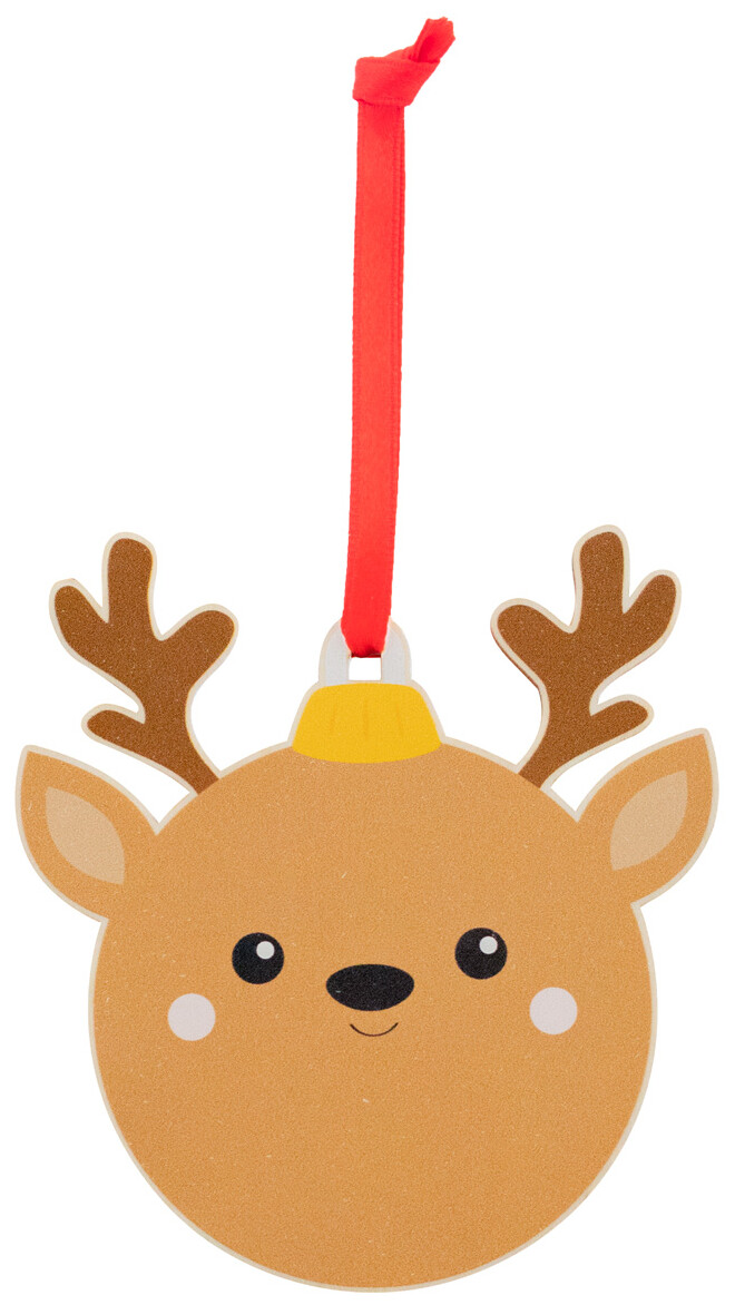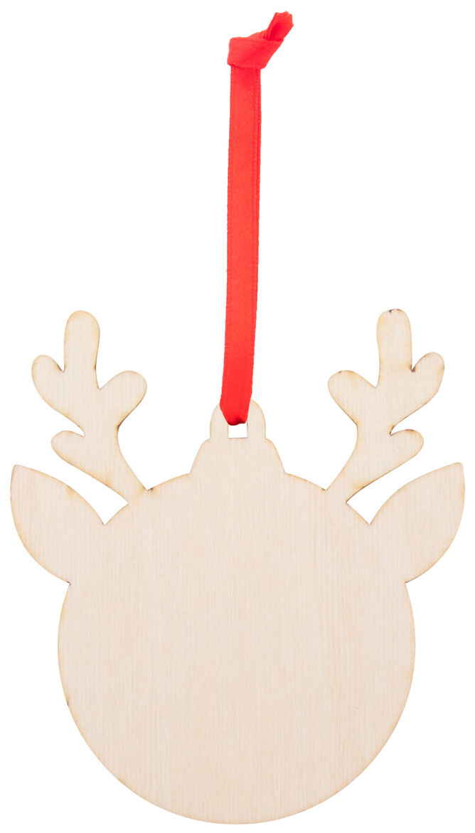 Vánoční ozdoba z březové překližky, s tištěným vánočním designem a červenou stužkou, která je dodávána zvlášť.