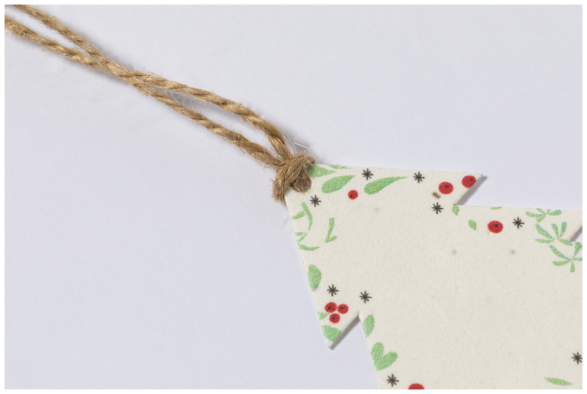 Papírová ozdoba na vánoční stromeček s jutovým provázkem. Obal semenného papíru obsahuje semena petúnie v různých barvách, která lze zasadit oddělením z provázku.