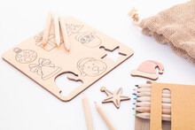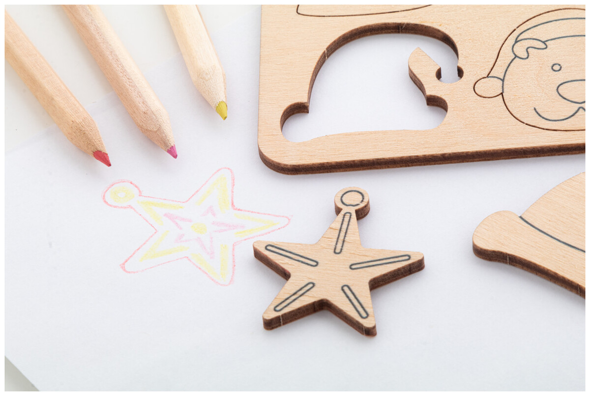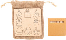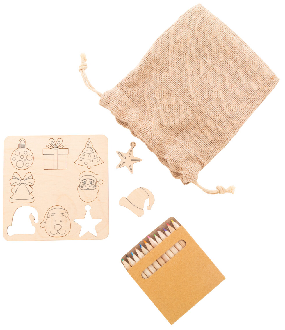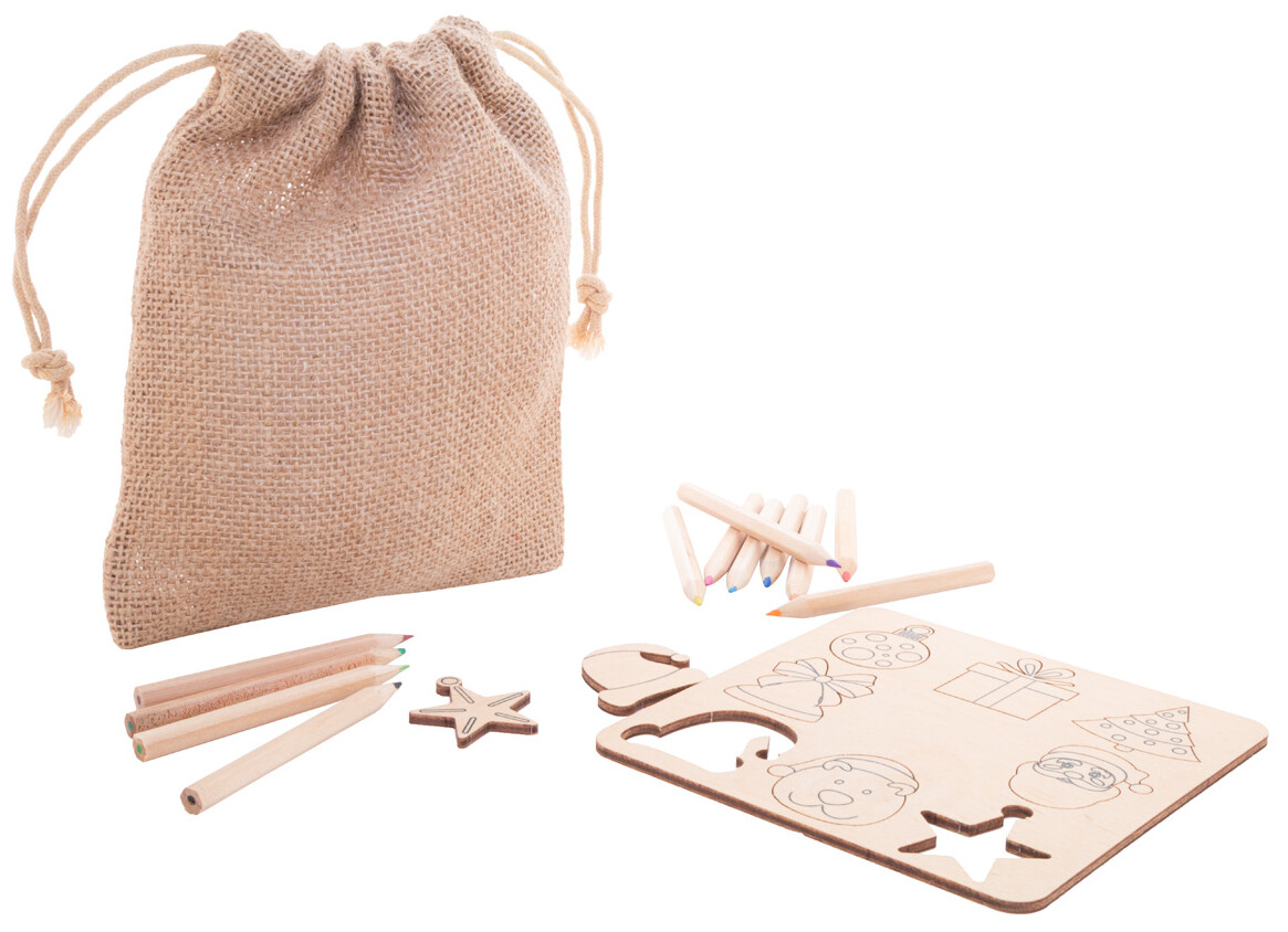 Vánoční vybarvovací hra z březové překližky s jutovým pouzdrem. Obsahuje tématické vyřezávané figurky (8 ks) a dřevěné barevné tužky (12 ks) v papírové krabičce.