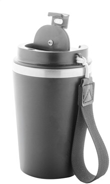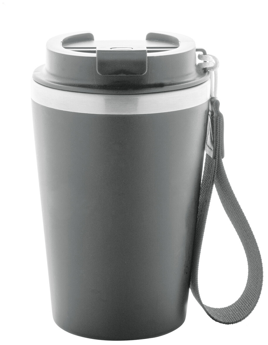 Dvoustěnný termo hrnek z recyklované nerezové oceli s vnějším PP plastem a víčkem na pití. S popruhem na přenášení RPET. 350 ml.