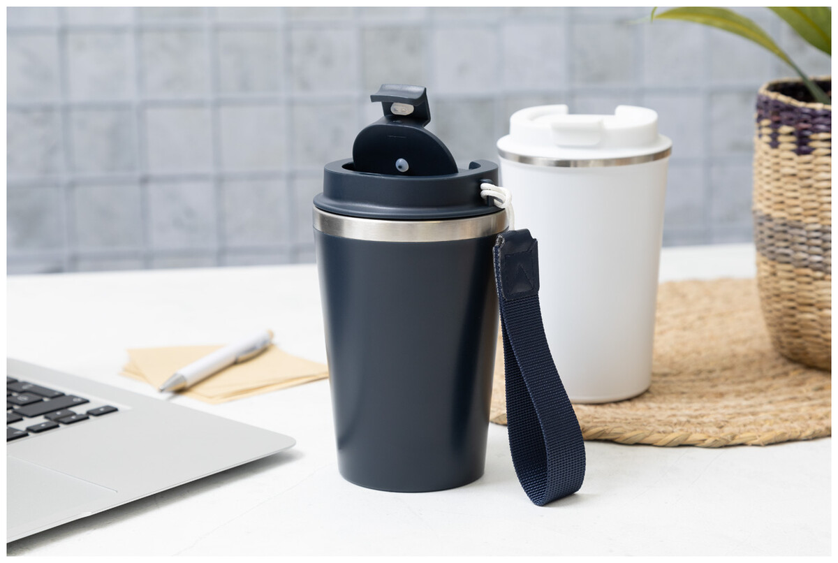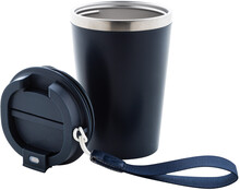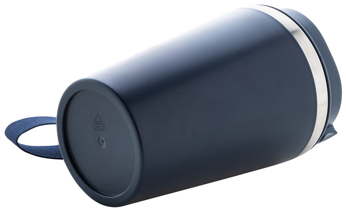 Dvoustěnný termo hrnek z recyklované nerezové oceli s vnějším PP plastem a víčkem na pití. S popruhem na přenášení RPET. 350 ml.
