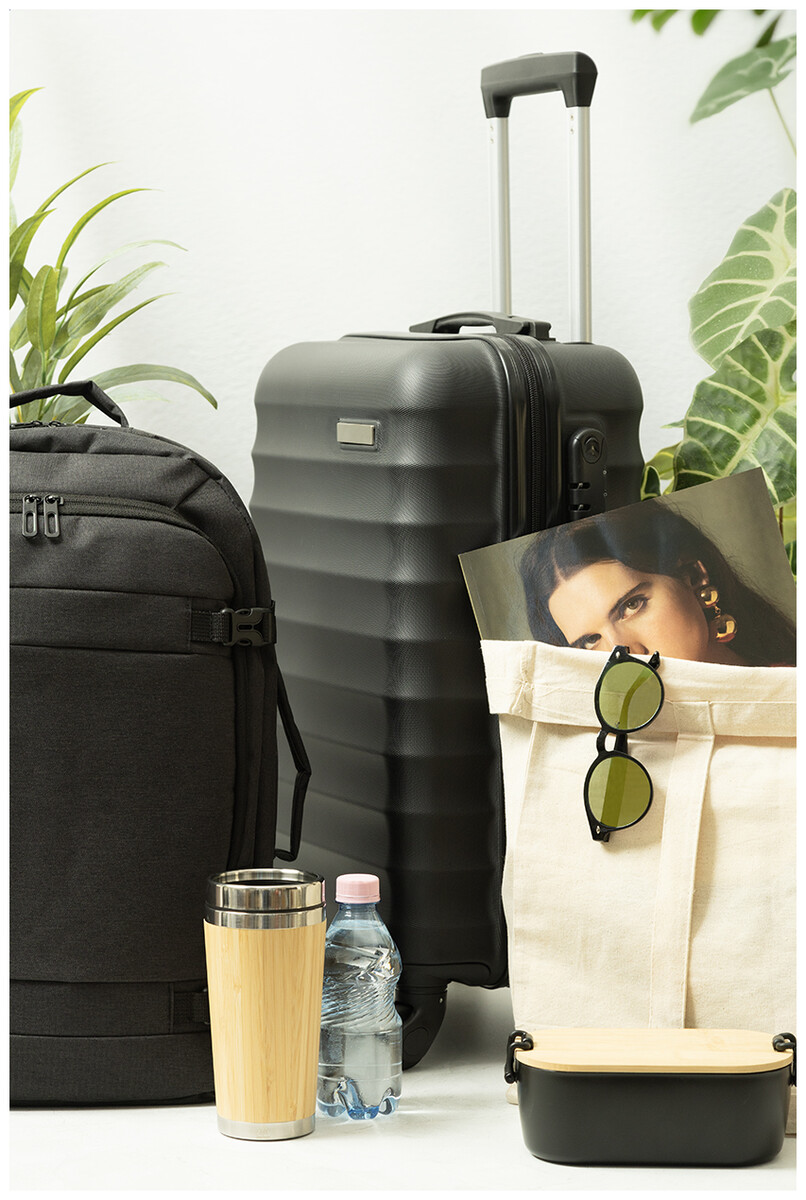 20palcová příruční taška na kolečkách s pevnou skořepinou z materiálu RPET se 4 kolečky, teleskopickou rukojetí a kombinovaným zámkem. S vnitřní podšívkou z RPET a elastickými upevňovacími popruhy. S kovovou destičkou pro gravírování loga