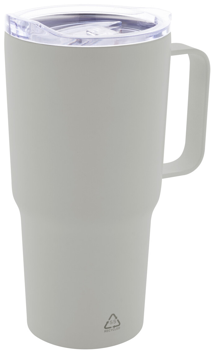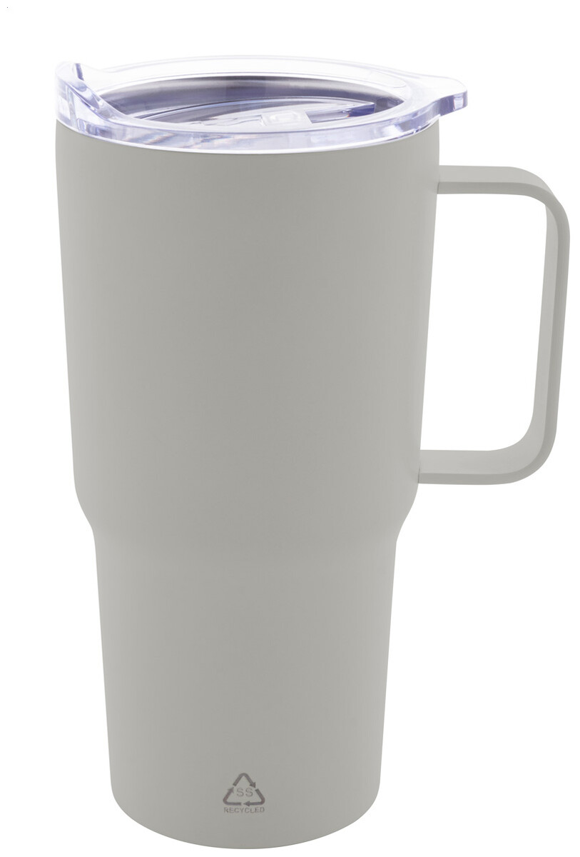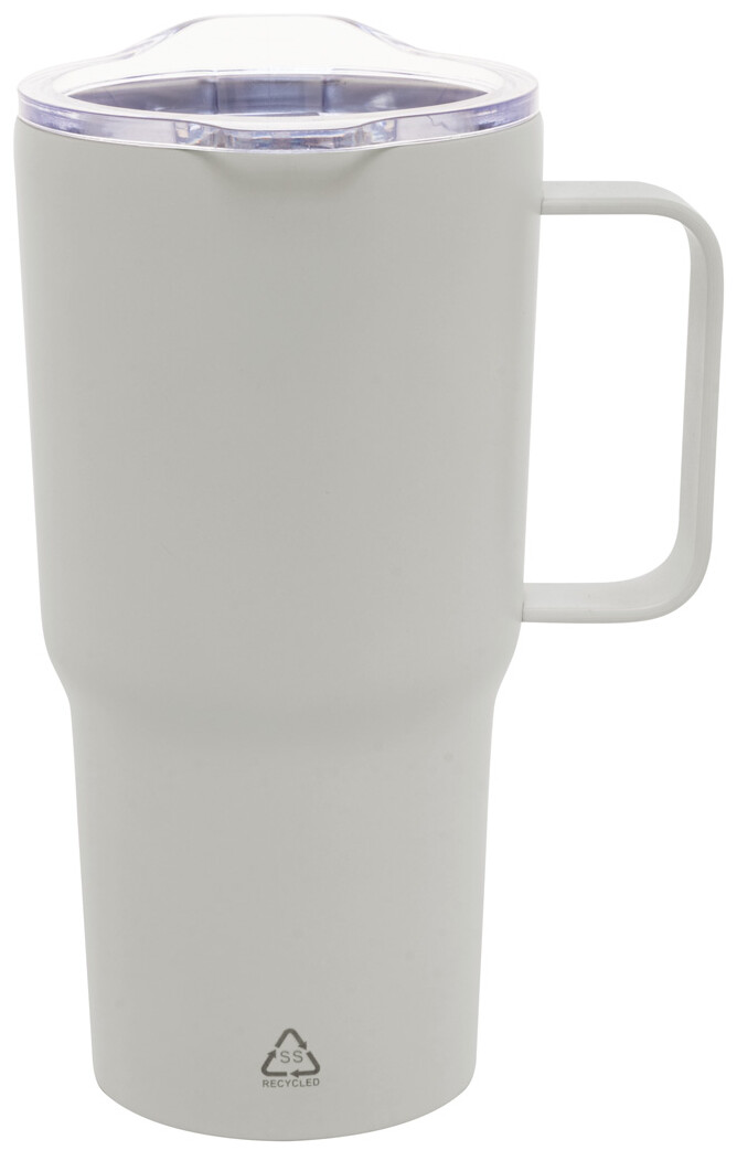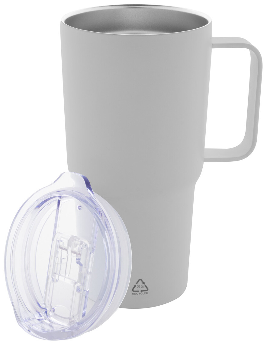 Dvoustěnný vakuově izolovaný termo hrnek z recyklované nerezové oceli s plastovým víčkem na pití z PS. 600 ml.