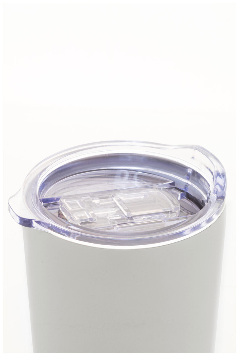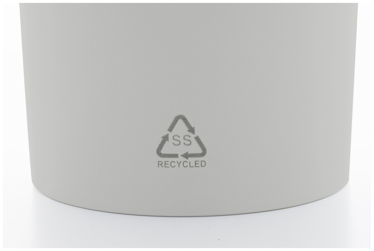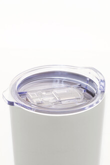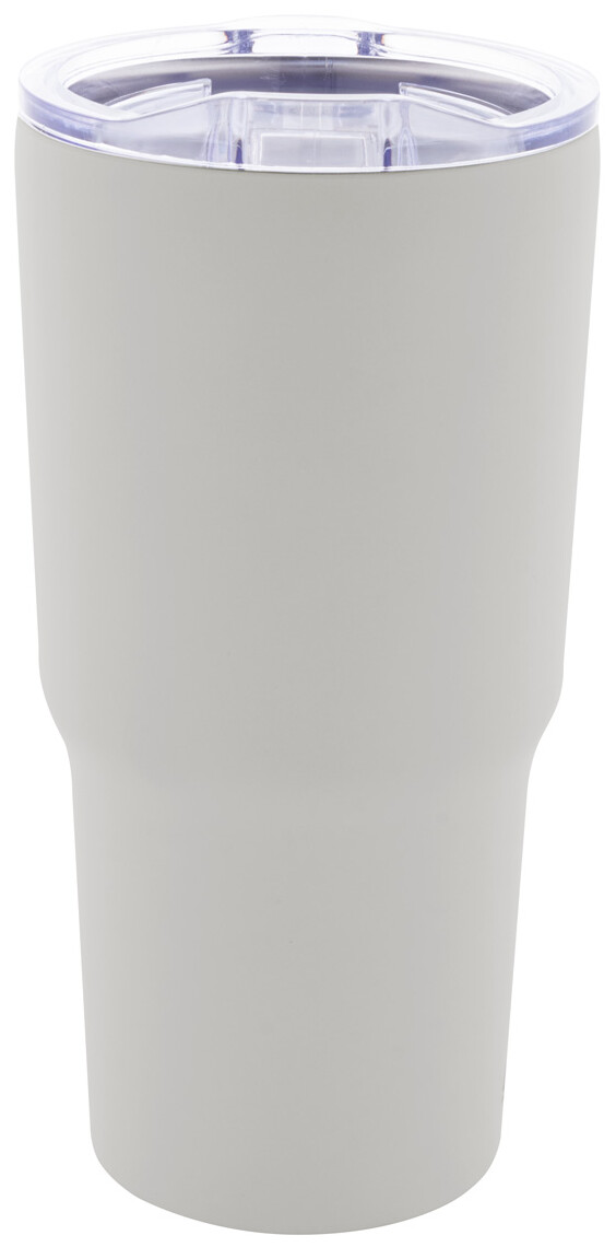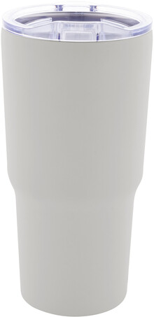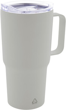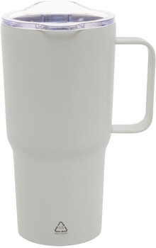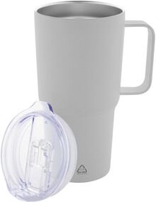 Dvoustěnný vakuově izolovaný termo hrnek z recyklované nerezové oceli s plastovým víčkem na pití z PS. 600 ml.