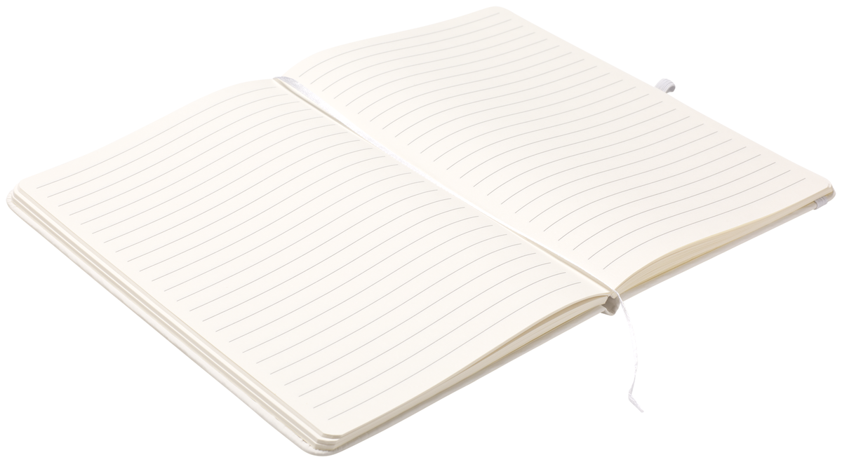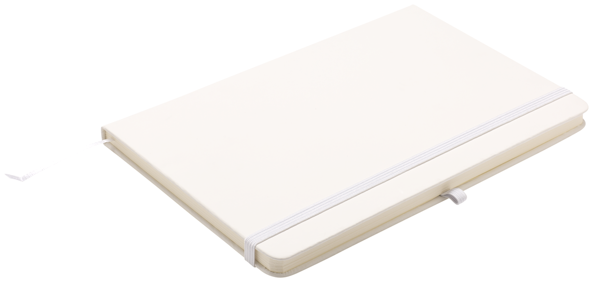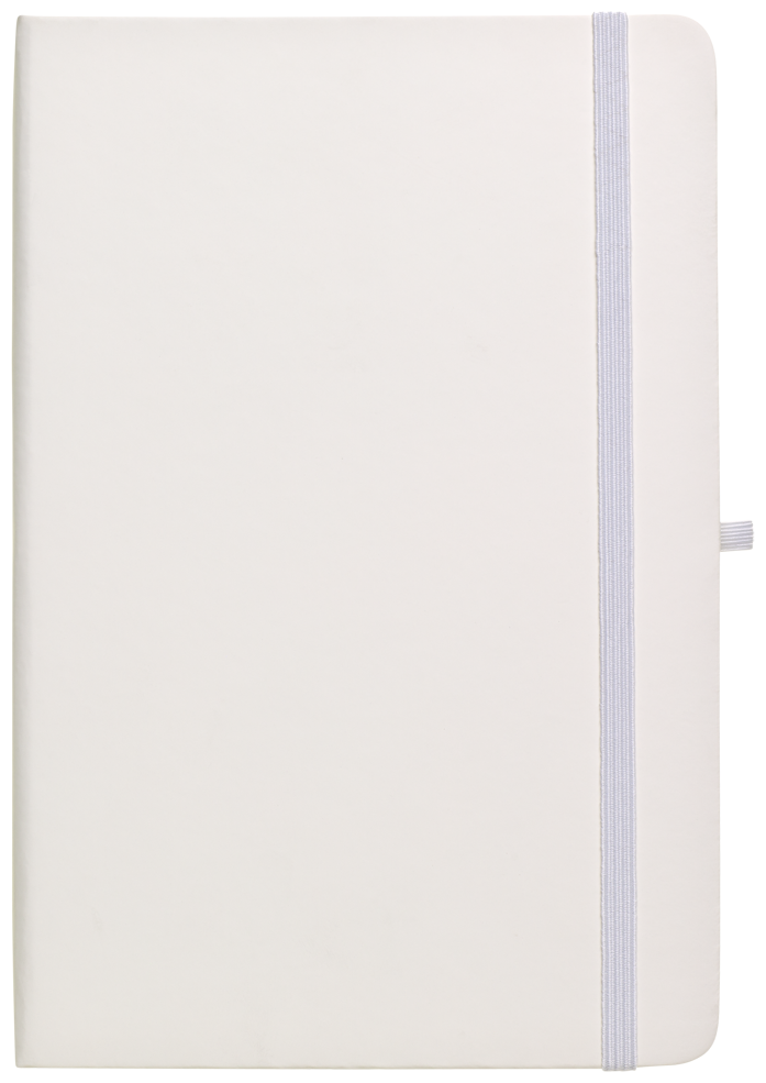 Zápisník A5 v bílých deskách z PU materiálu má 80 linkovaných listů. Blok má uzavírací gumičku, poutko na propisku a textilní záložku v barvě desek.