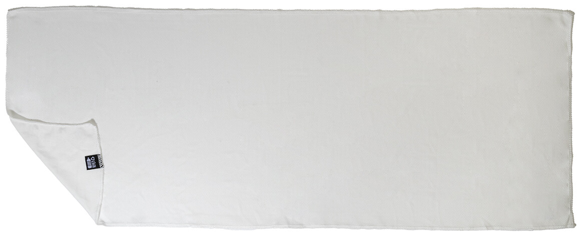 Sportovní ručník z mikrovlákna RPET v přepravním pouzdře z netkané tkaniny RPET s charakteristickou etiketou RPET. Polyester RPET, 140 g/m2.