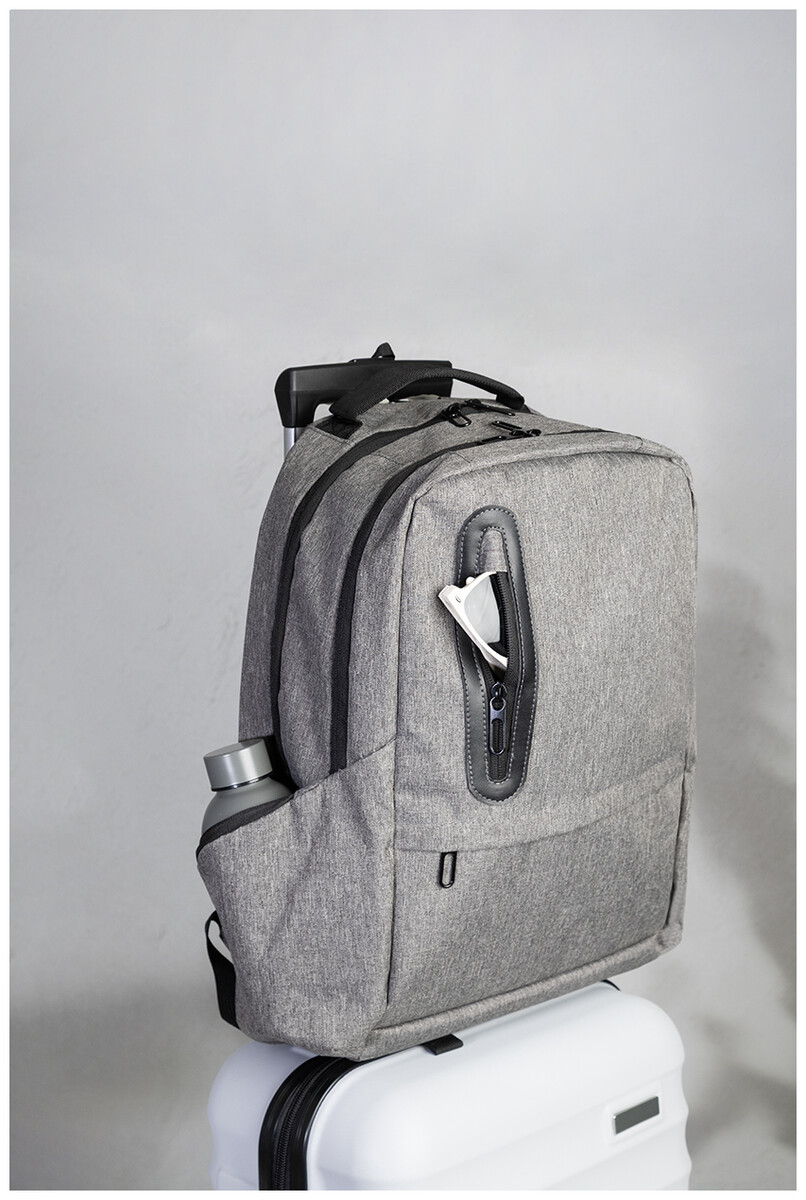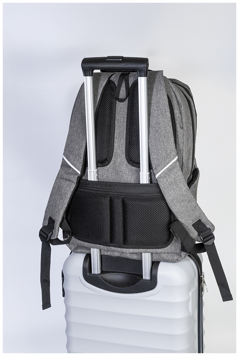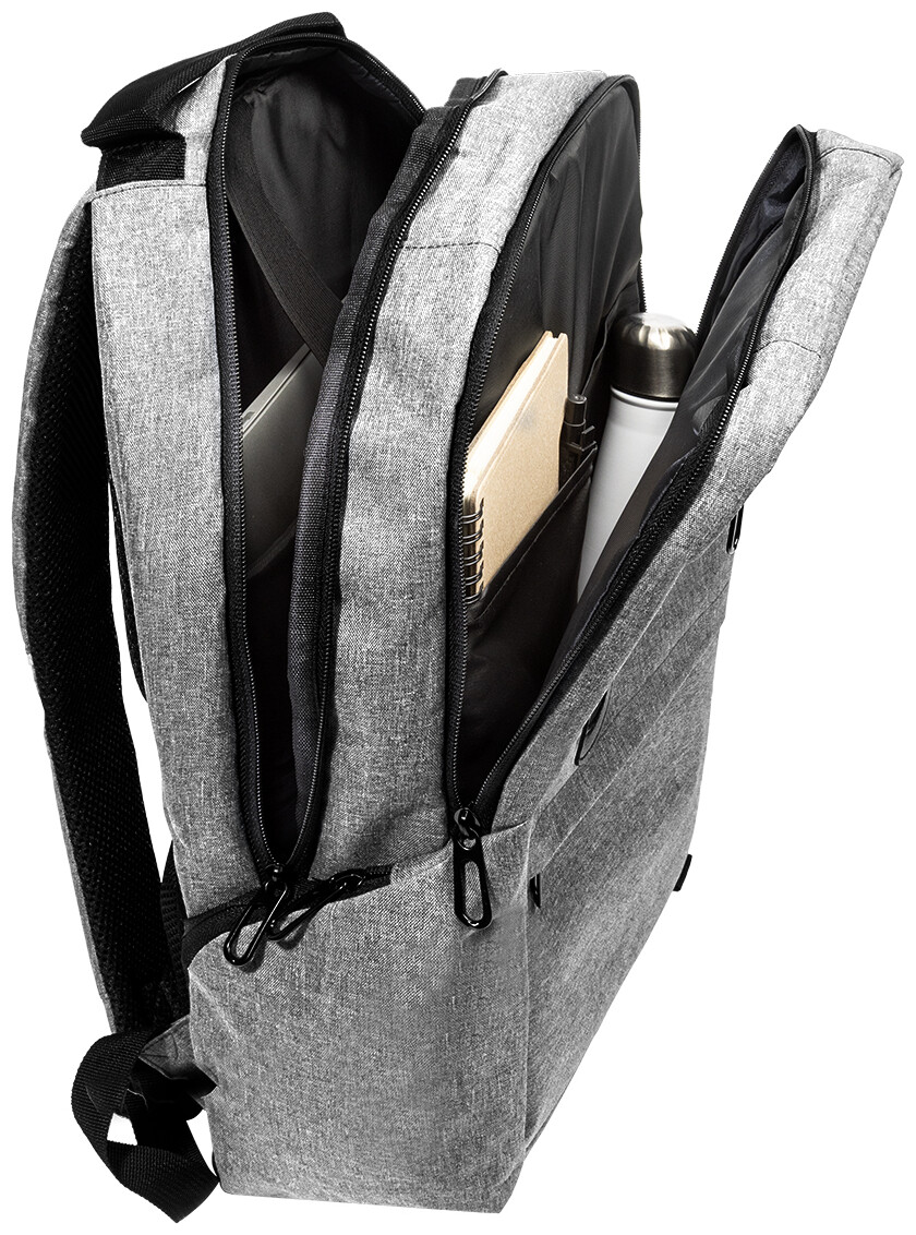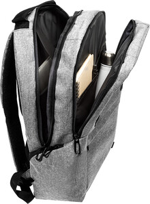 Batoh z RPET s přihrádkami na zip, 2 předními kapsami na zip, bočními kapsami na zip a polstrovanou přihrádkou na notebook (15"). S polstrovanými zády a ramenními popruhy, kapsou s ochranou proti krádeži a popruhem na kufr. Z polyesteru 300D RPET s výrazným štítkem RPET.