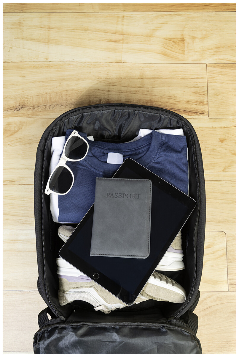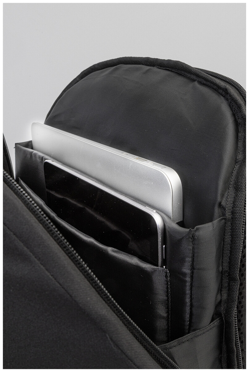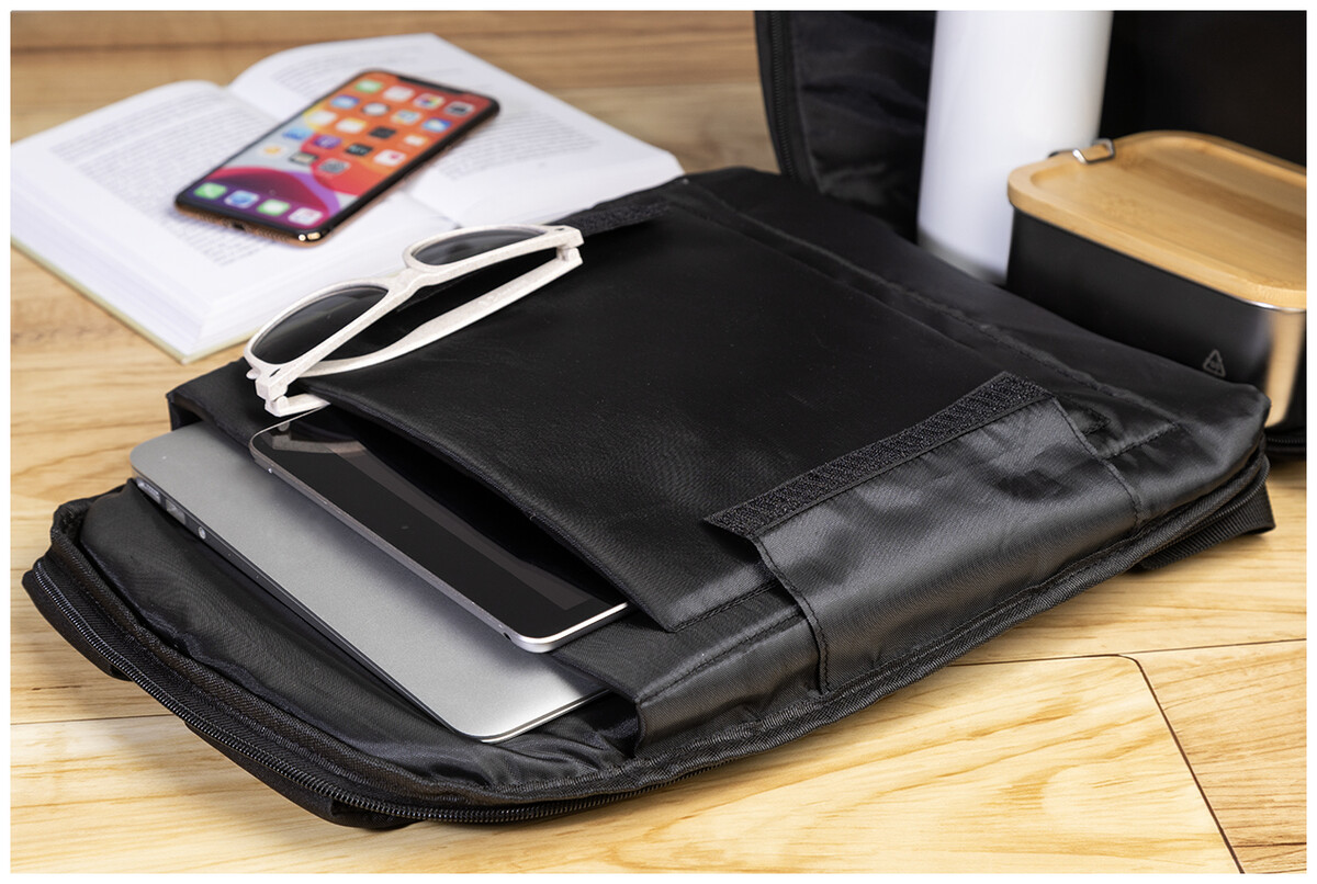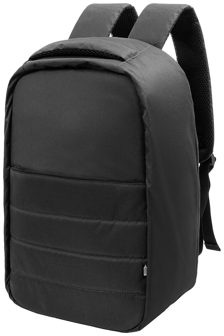 Batoh z RPET s ochranou proti krádeži s přihrádkou na zip, polstrovanou přihrádkou na notebook (15") a tablet (12"), popruhem na kufr, polstrovanými zády a ramenními popruhy. Se skrytou kapsou proti krádeži. Polyester 300D RPET. S výrazným štítkem RPET.