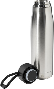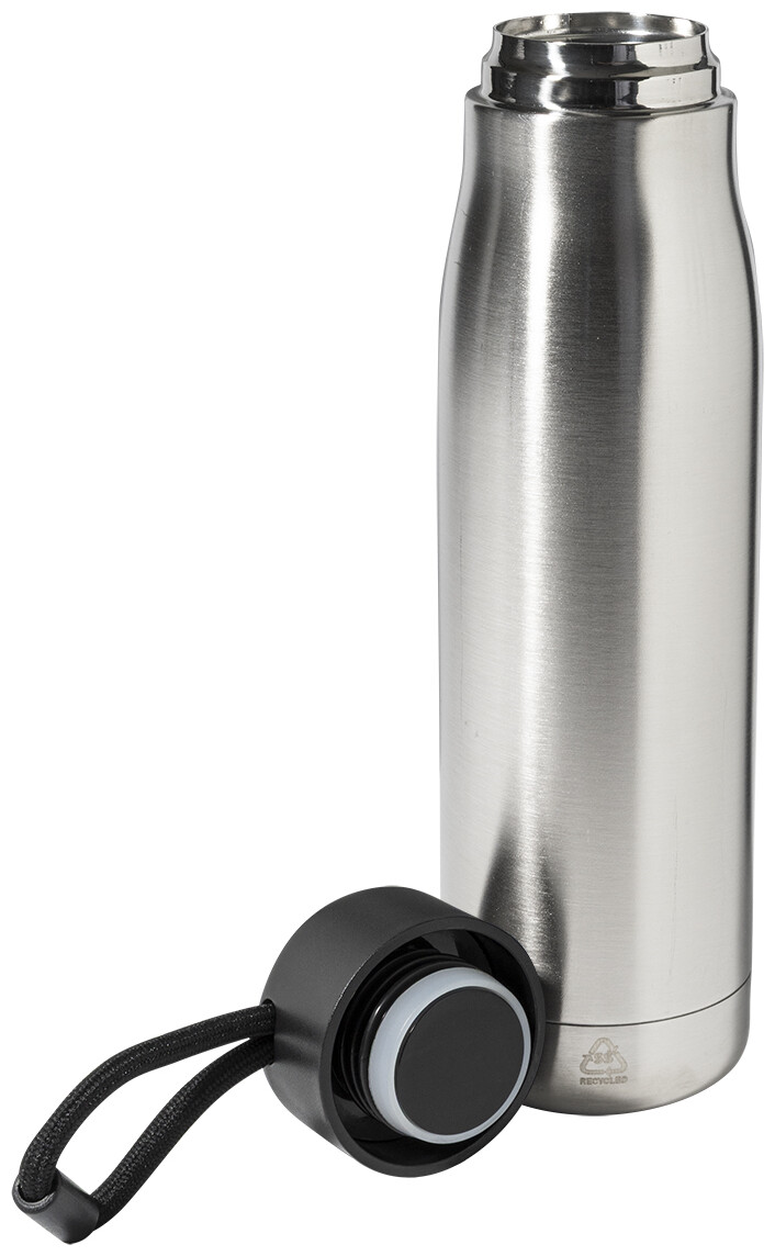 Dvoustěnná, vakuově izolovaná láhev z recyklované nerezové oceli s PP víčkem a integrovaným poutkem na nošení se šňůrkou. 500 ml.