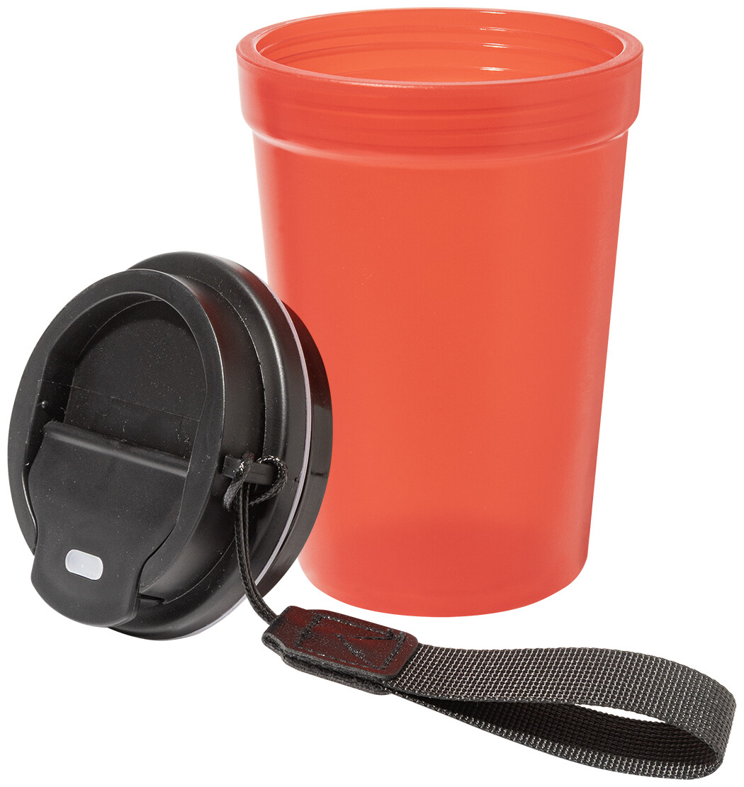 Jednostěnný cestovní kelímek z PP plastu s matnou povrchovou úpravou, víčkem na pití a poutkem z RPET polyesteru. 400 ml.