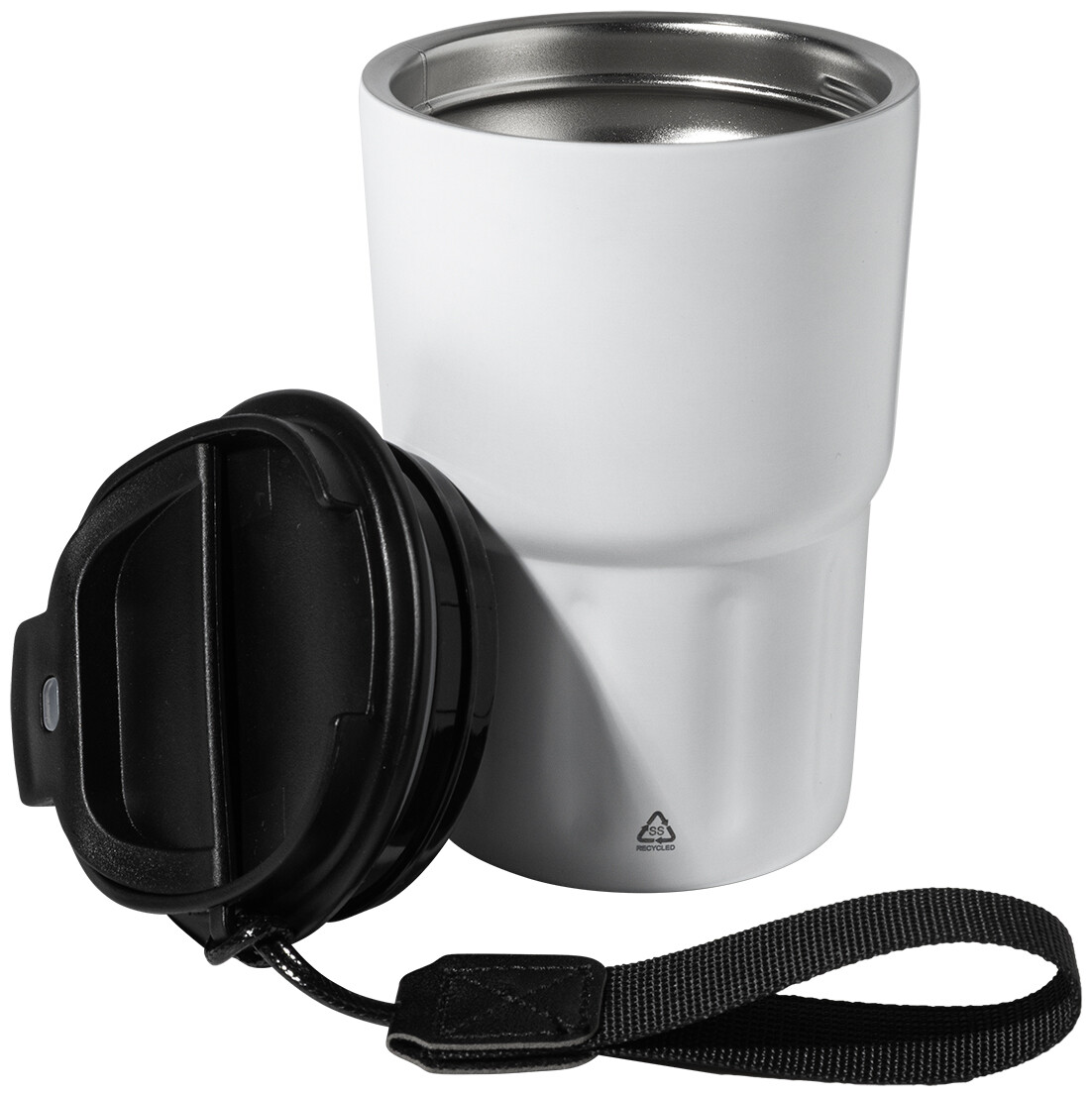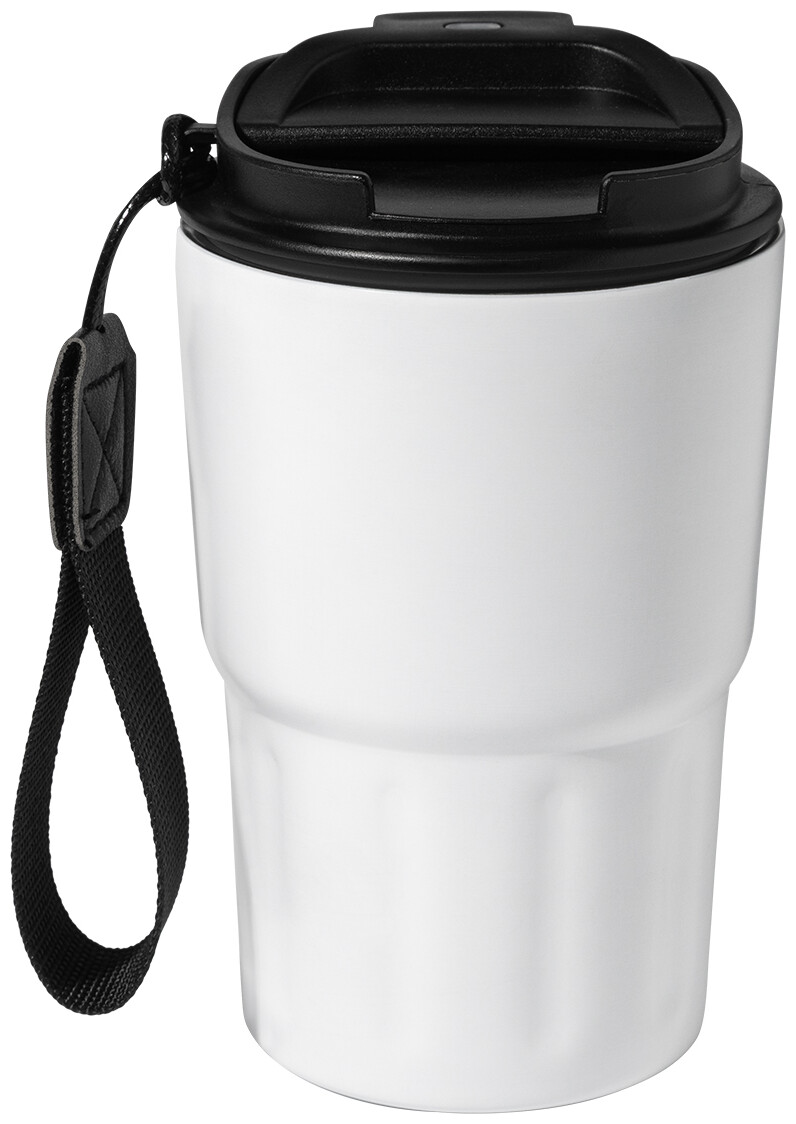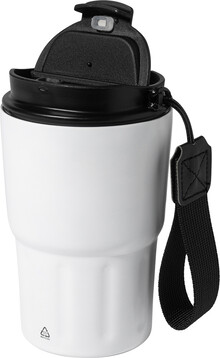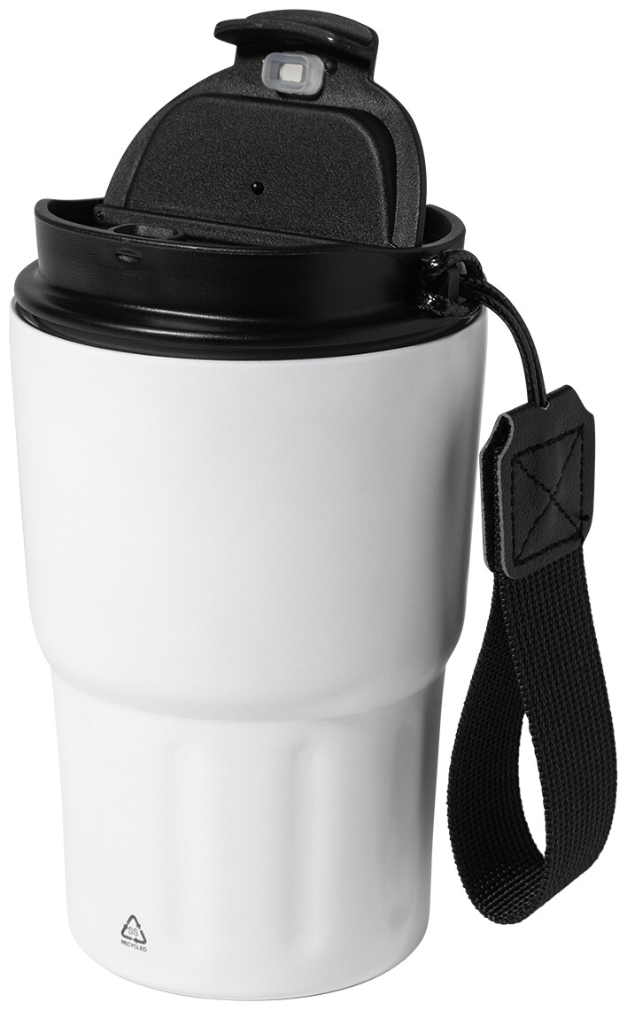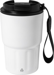 Dvoustěnný termo hrnek z recyklované nerezové oceli s izolačním víčkem z PP. S poutkem z RPET polyesteru. 350 ml.