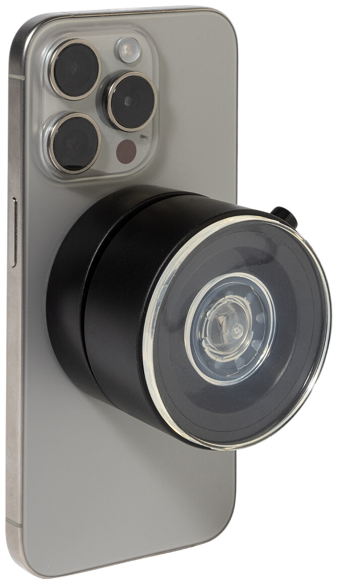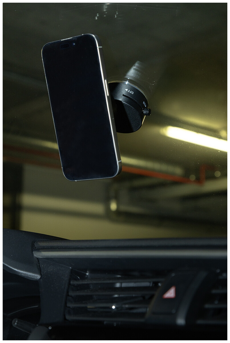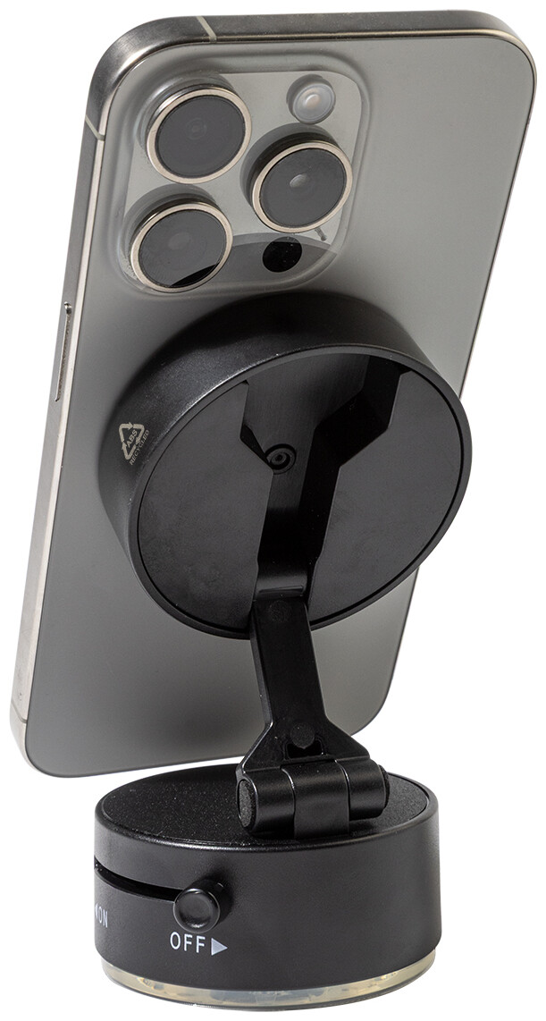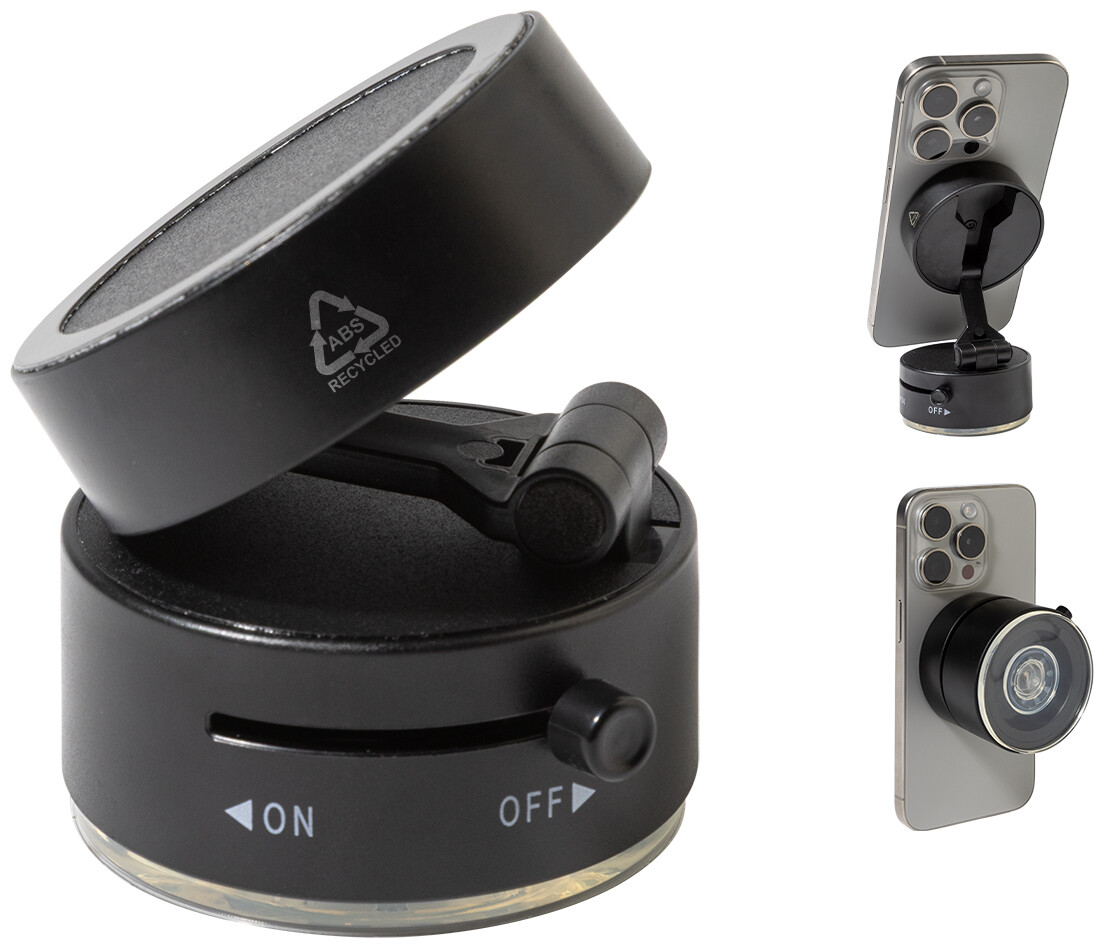 Magnetický držák na mobil do auta z recyklovaného ABS materiálu s přísavkou. Včetně samolepicího kovového kroužku pro telefony bez magnetického povrchu.