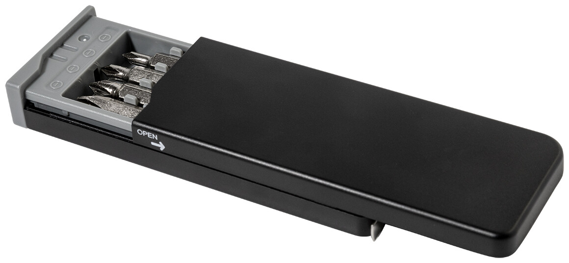 Kompaktní sada nářadí v pouzdře z recyklovaného ABS materiálu s 8 šroubovacími bity a vestavěným 1m metrem.
