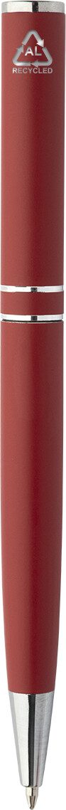 Kuličkové pero z recyklovaného hliníku s chromovanými částmi a kroužky. V černé dárkové krabičce. S modrou náplní.