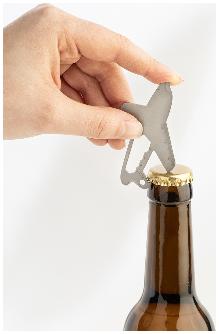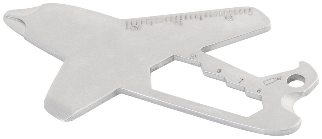 Přívěsek na klíče s multifunkčním nástrojem ve tvaru letadla z recyklované nerezové oceli s otvírákem na lahve, pravítkem, křížovým a plochým šroubovákem, imbusovým klíčem a štípačkou na drát.