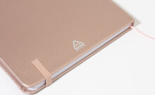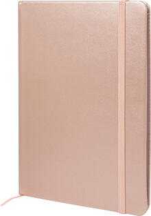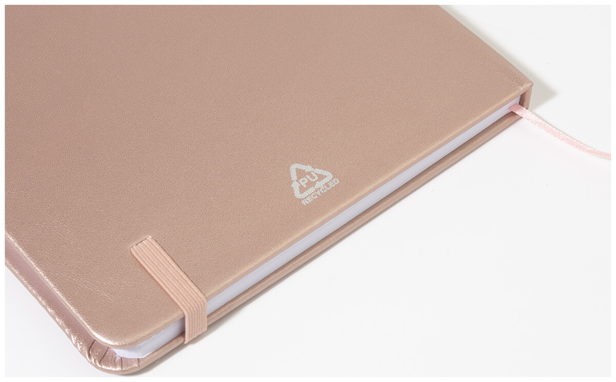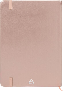 Blok A5 s potahem z recyklované PU kůže s metalickou úpravou se 100 linkovanými listy z recyklovaného papíru. S barevnou záložkou a gumičkou.