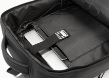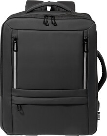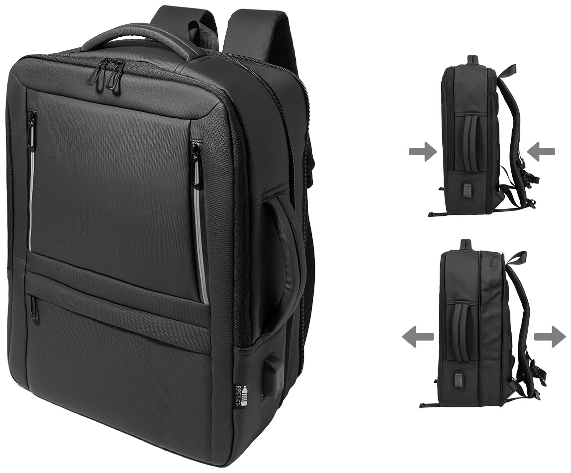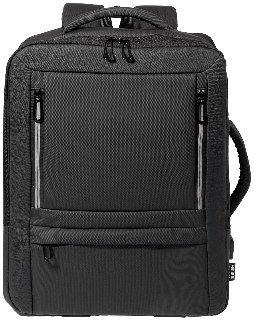 Voděodolný batoh a taška na dokumenty z RPET s možností prodloužení a hlavní přihrádkou na zip, předními kapsami s reflexními zipy, polstrovanou přihrádkou na notebook (15") a tablet (12") a vestavěným USB portem pro power banky. S popruhem na kufry, polstrovanými zády a ramenními popruhy s hrudním popruhem. Polyester 600D RPET s PU zátěrem a výrazným štítkem RPET.