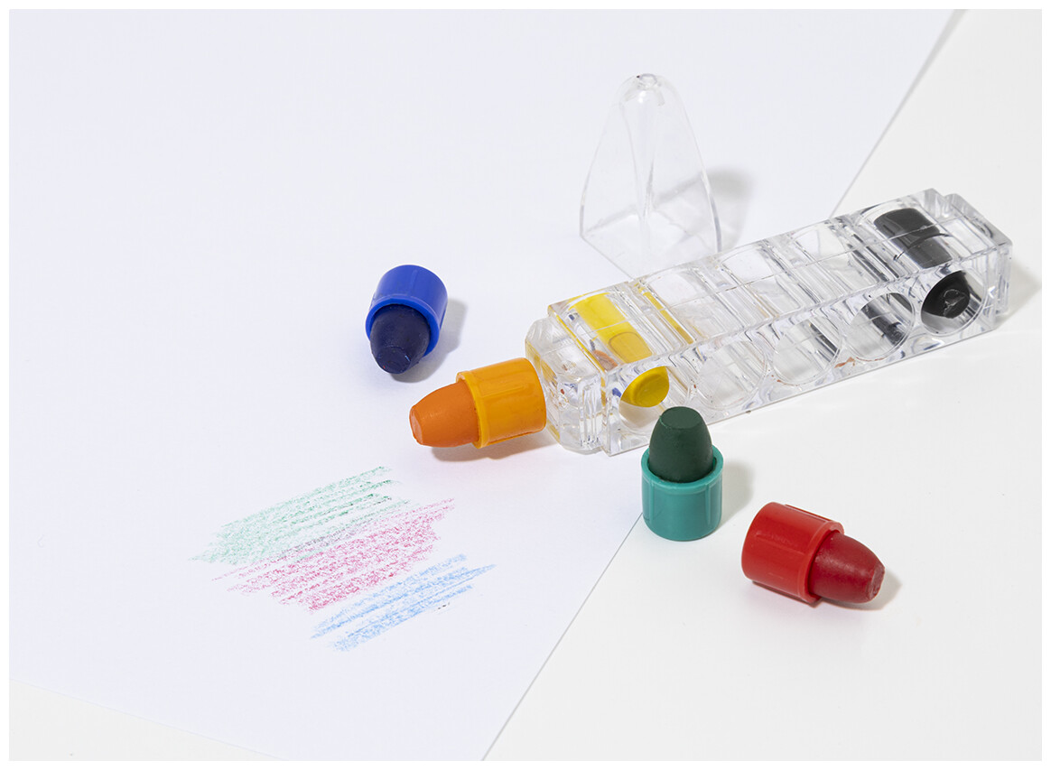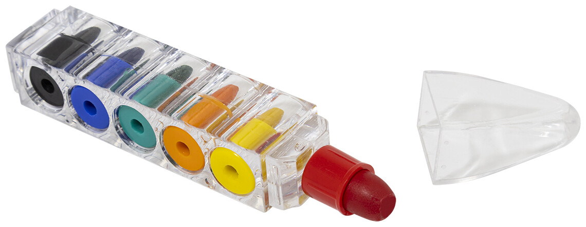 Barevné hroty voskovek (6 ks) v průhledné nádobce ve tvaru pera.