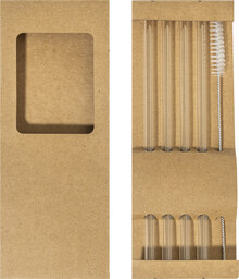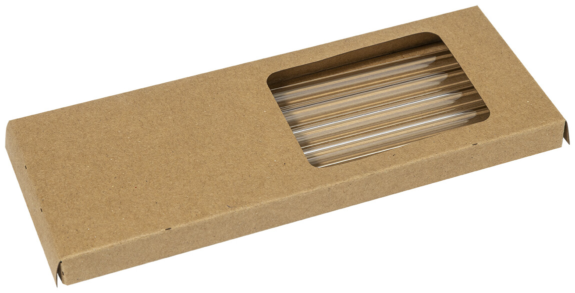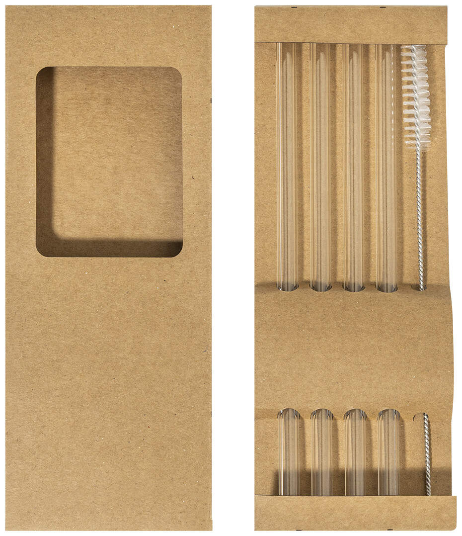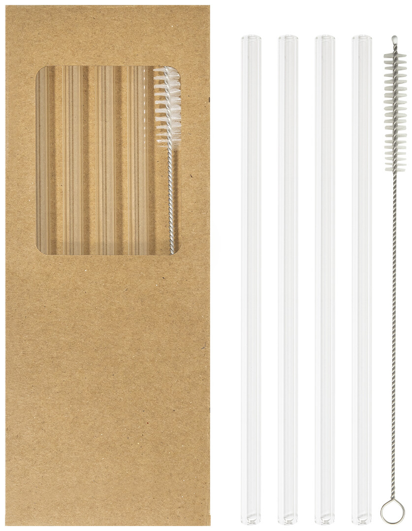 Sada 4 opakovaně použitelných brček na pití z borosilikátového skla s čisticím kartáčkem. V krabičce z kraftového papíru.