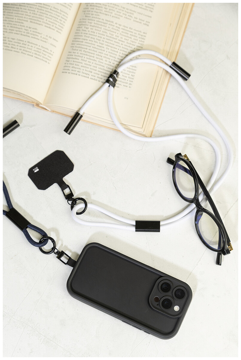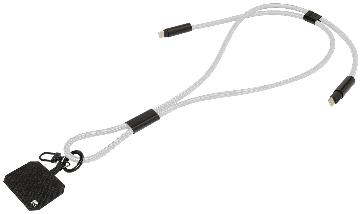 Šňůrka s držákem na mobil z RPET s vložkou pro telefon, karabinou a integrovaným nabíjecím kabelem USB-C na USB-C se skrytými konektory. Podporuje rychlé nabíjení a přenos dat PD 60W.