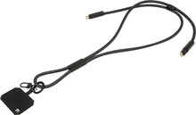 Šňůrka s držákem na mobil z RPET s vložkou pro telefon, karabinou a integrovaným nabíjecím kabelem USB-C na USB-C se skrytými konektory. Podporuje rychlé nabíjení a přenos dat PD 60W.