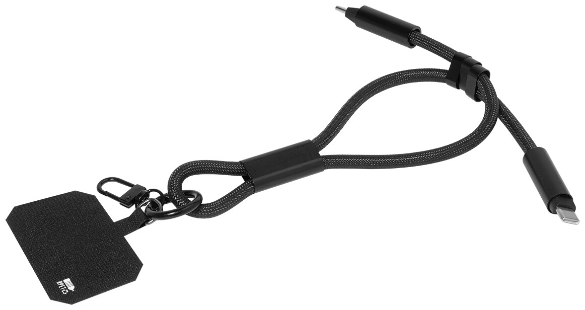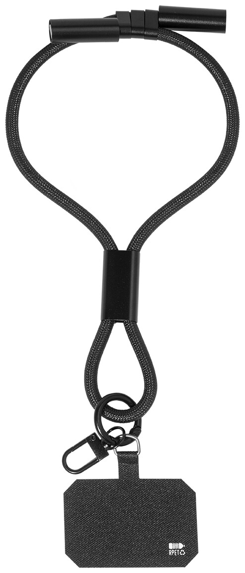 Náramek z RPET s držákem na mobil, vložkou pro telefon, karabinou a integrovaným nabíjecím kabelem USB-C/USB-C se skrytými konektory. Podporuje rychlé nabíjení a přenos dat PD s výkonem 60 W.