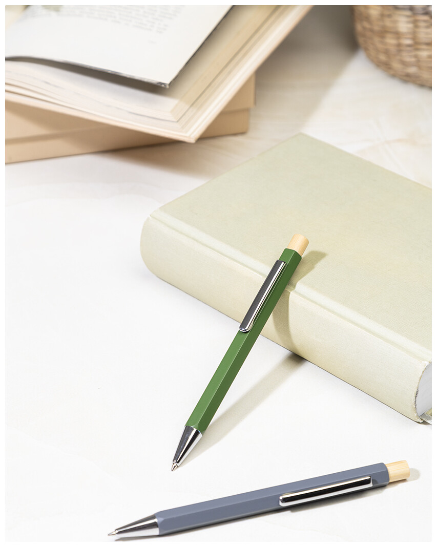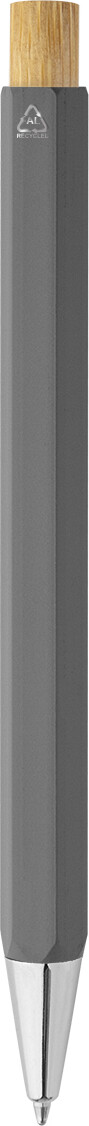 Šestihranné kuličkové pero z recyklovaného hliníku s bambusovým tlačítkem a chromovanými částmi. S modrou náplní.