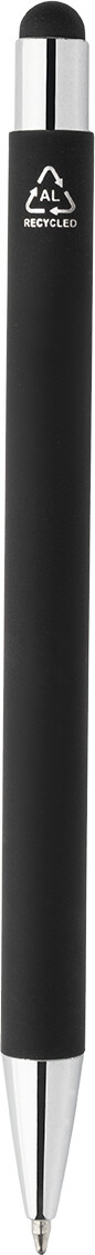 Kuličkové pero z recyklovaného hliníku na dotykovou obrazovku, s černým pogumovaným tělem a barevnými lesklými kovovými částmi. Se speciálním povrchem pro zrcadlové gravírování, které ladí s kovovými částmi. S modrou náplní.