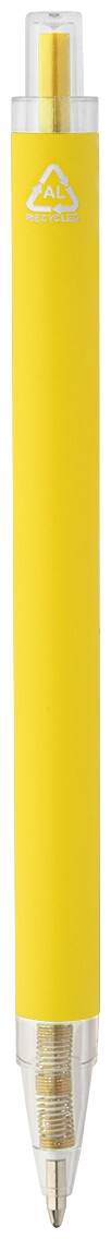 Kuličkové pero z recyklovaného hliníku s matným tělem a průhlednými RPET částmi. S modrou náplní.