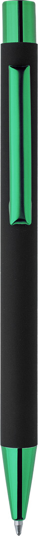 Kuličkové pero z recyklovaného hliníku s černým pogumovaným tělem a barevnými lesklými kovovými částmi. Se speciálním povrchem pro zrcadlové gravírování, které ladí s kovovými částmi. S modrou náplní.