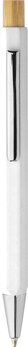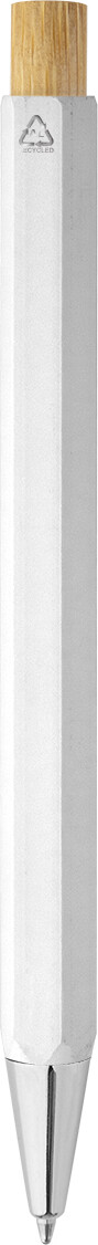 Šestihranné kuličkové pero z recyklovaného hliníku s bambusovým tlačítkem a chromovanými částmi. S modrou náplní.