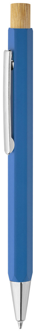Šestihranné kuličkové pero z recyklovaného hliníku s bambusovým tlačítkem a chromovanými částmi. S modrou náplní.