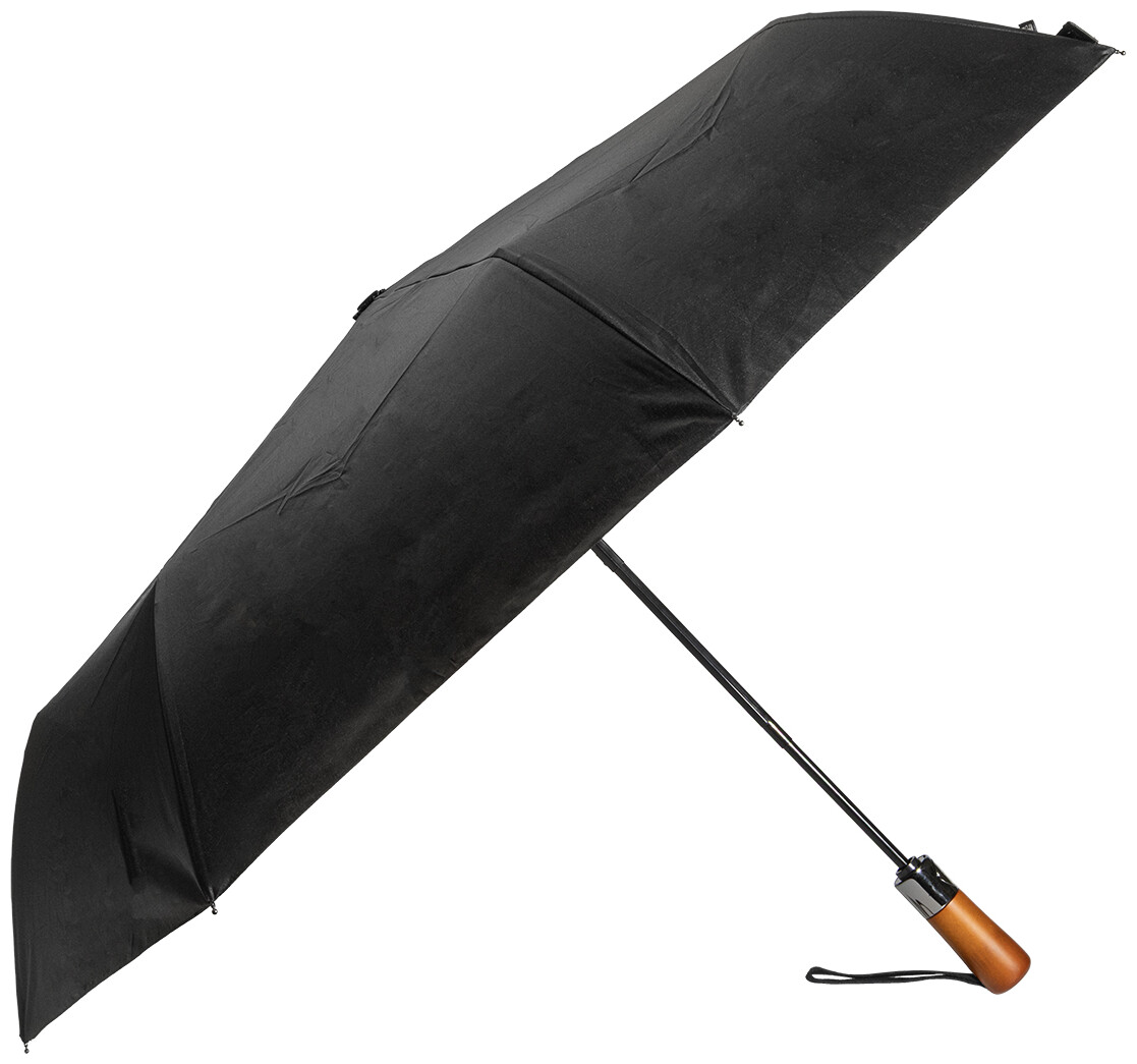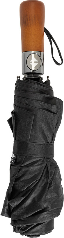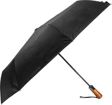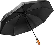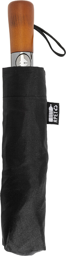 Velký, plně automatický (otevřít/zavřít) větruodolný skládací deštník s 8 panely a elegantní dřevěnou rukojetí s poutkem na ruku. S kovovým rámem a žebry ze skelných vláken. 190T RPET pongee. S charakteristickým RPET štítkem.