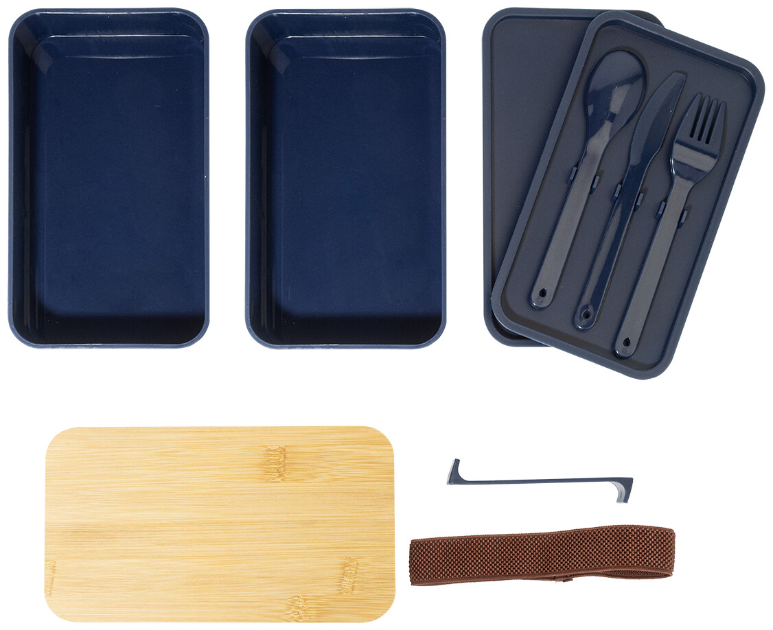 Box na jídlo z PP plastu se sadou příborů (vidlička, lžíce a nůž), bambusovým víkem a elastickým popruhem. Se 2 přihrádkami o objemu 700 ml.