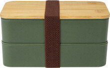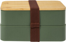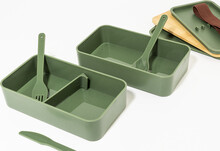 Box na jídlo z PP plastu se sadou příborů (vidlička, lžíce a nůž), bambusovým víkem a elastickým popruhem. Se 2 přihrádkami o objemu 700 ml.