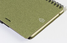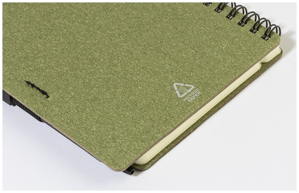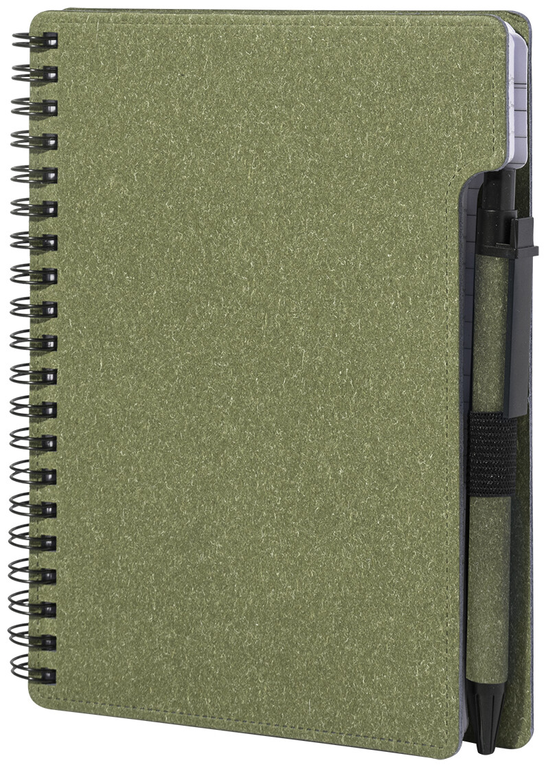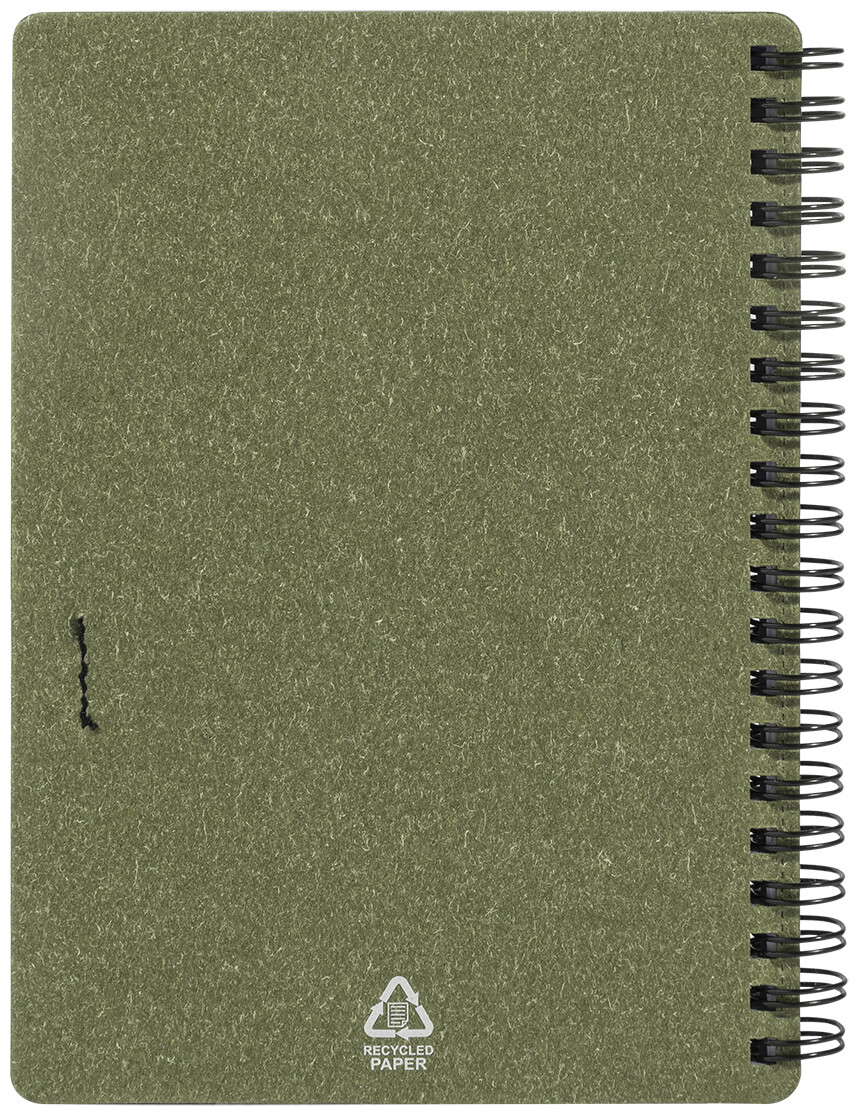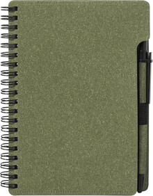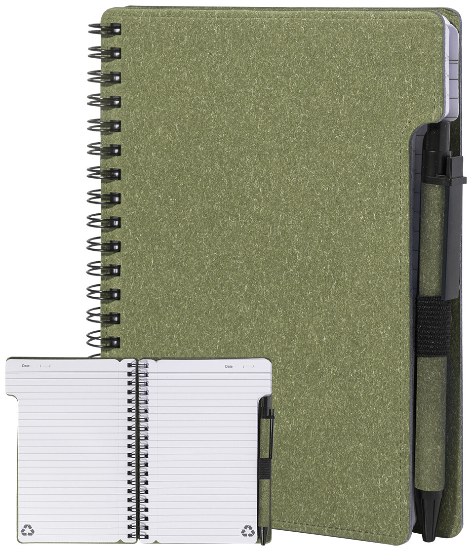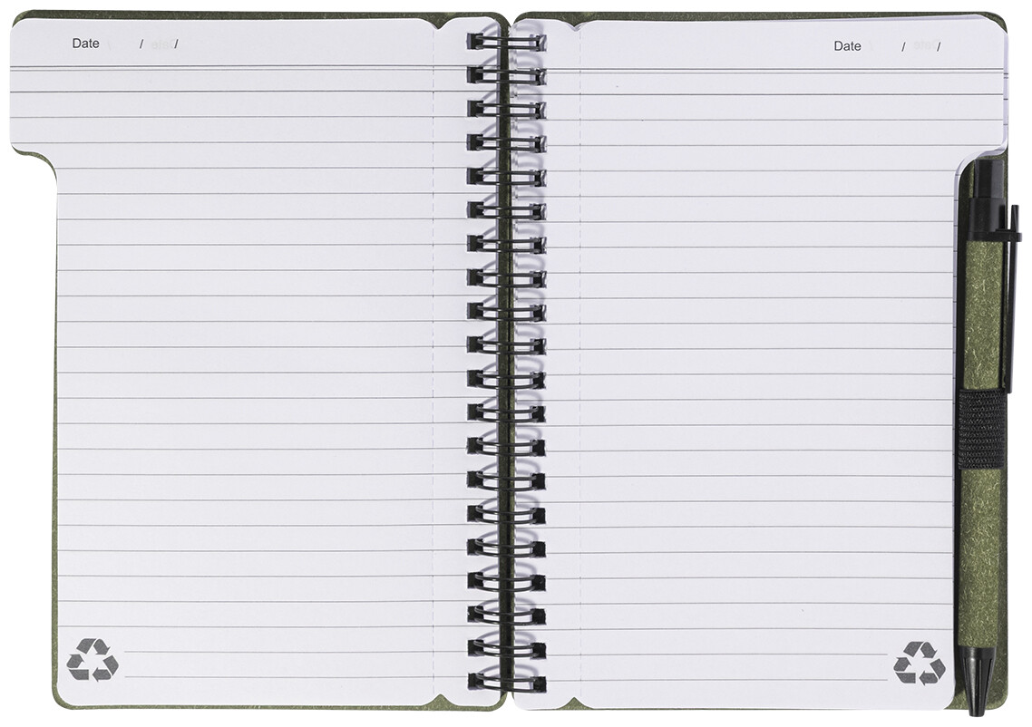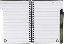 Spirálový blok A6 z recyklovaného papíru s 80 linkovanými listy. Včetně recyklovaného papíru a kuličkového pera z recyklovaného PP s modrou náplní.