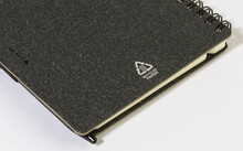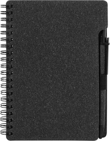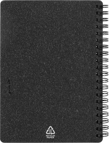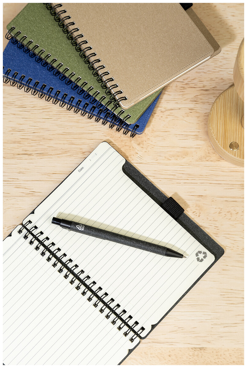Spirálový blok A6 z recyklovaného papíru s 80 linkovanými listy. Včetně recyklovaného papíru a kuličkového pera z recyklovaného PP s modrou náplní.