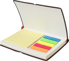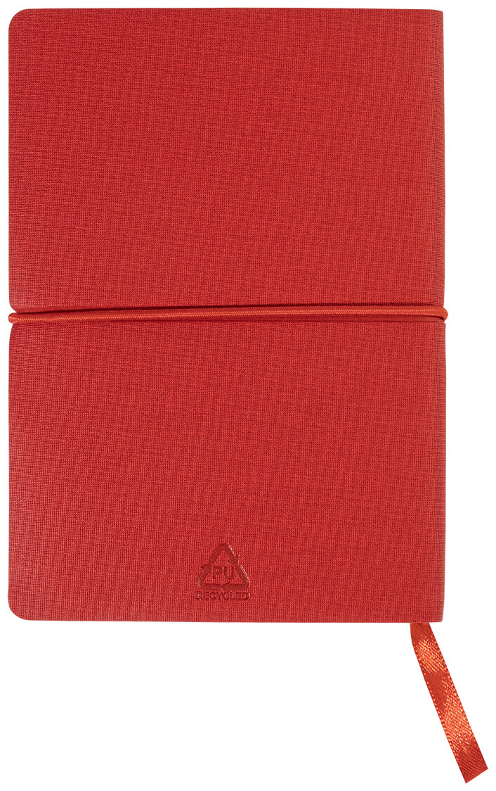 Blok A6 s recyklovanou PU kůží, 70 linkovanými listy z recyklovaného papíru, 25 samolepicími papírky a 125 značkovači stránek (v 5 různých barvách). Se záložkou a horizontálním gumovým páskem.