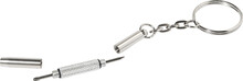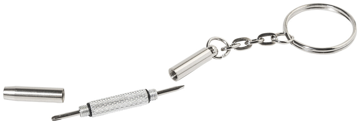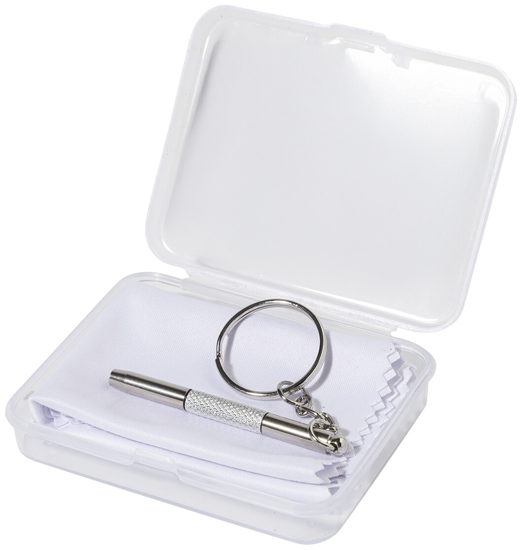 Kompaktní sada na opravu brýlí v průhledné PP krabičce. Včetně čisticího hadříku ze 100% RPET mikrovlákna (220 g/m2) a mini šroubováku s klíčenkou. Rozměr hadříku: 18×15 cm.