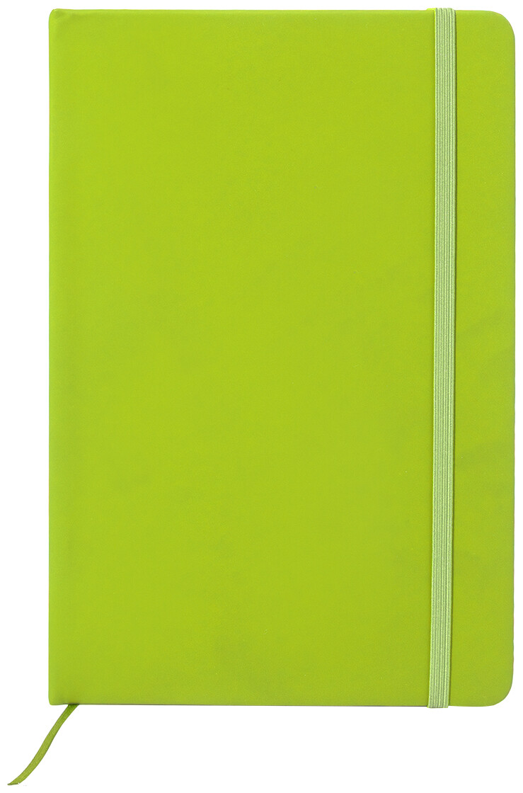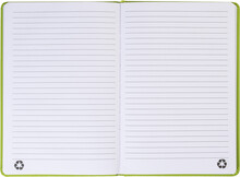 Blok potažený recyklovanou PU kůží se 100 linkovanými listy z recyklovaného papíru. Se záložkou v odpovídající barvě a gumičkou. Velikost A5.