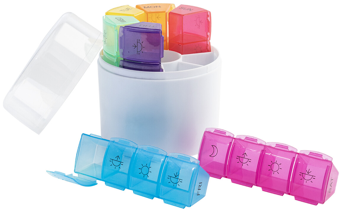 Sada týdenních krabiček na léky z recyklovaného ABS plastu se 7 denními krabičkami, každá se 4 přihrádkami pro různé denní doby. V kulatém stojanu s průhledným víkem.