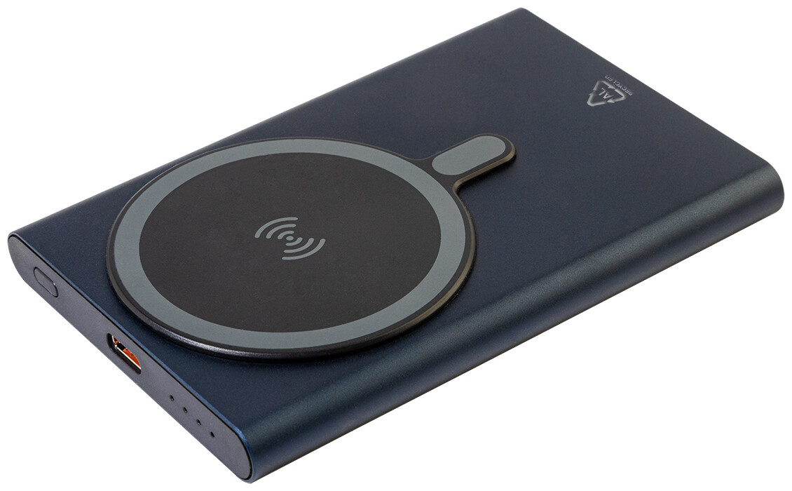 Power banka z recyklovaného hliníku s vestavěnou magnetickou bezdrátovou rychlonabíječkou (15 W) a 5000 mAh baterií. Se vstupem USB-C a portem pro nabíječku. Obsahuje samolepicí kovový kroužek pro použití magnetické funkce na jakémkoli bezdrátovém nabíjecím zařízení. Kompatibilní s iPhone® 12 nebo novějším. USB nabíjecí kabel součástí.